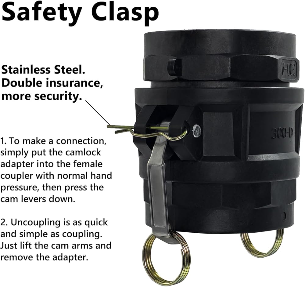 EASY TO INSTALL: Quick hose camlock couplings can connect/disconnect hose to tanks, pumps or other equipment in a faster way. It can be connected and disconnected without tools. Simply slide the cam lock adapter into the camlock coupling with normal hand pressure, then press the cam levers down. The working pressure of 3” is up to 150 psi