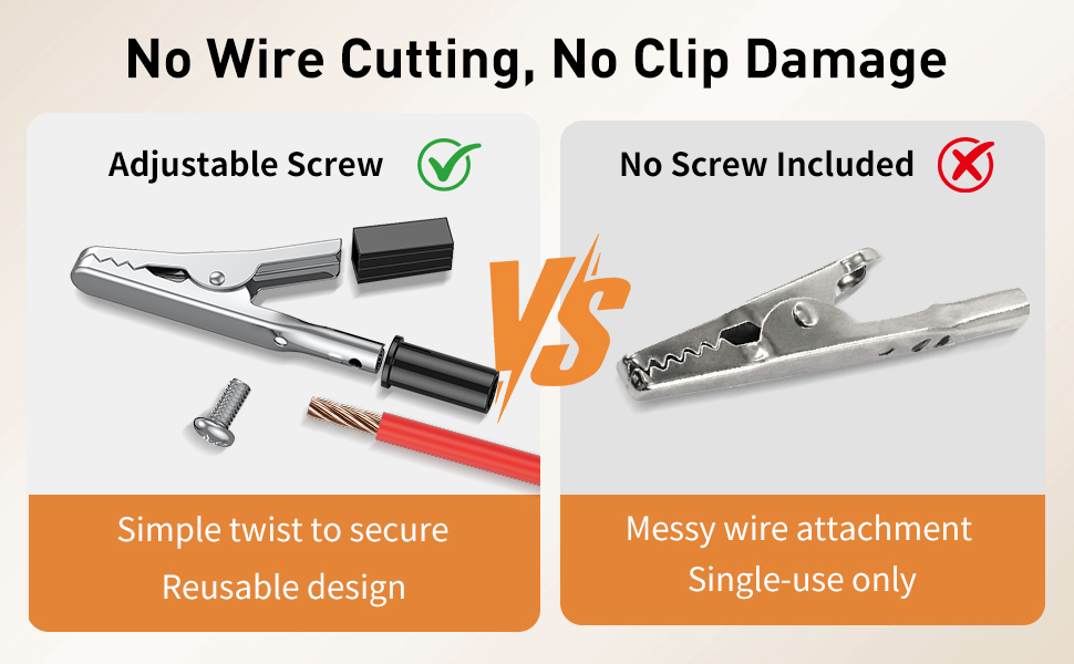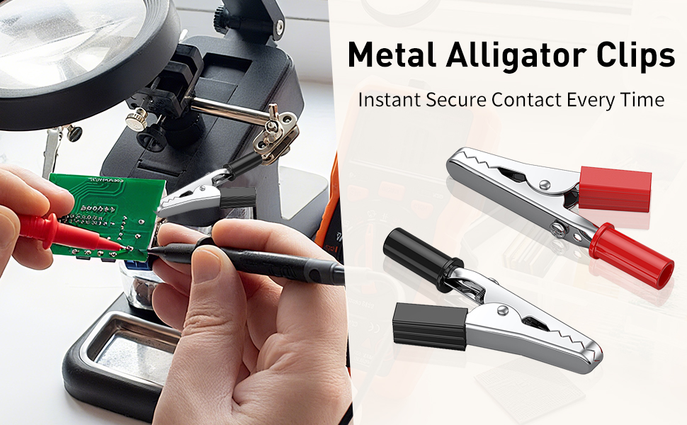 Reusable & Safe: The built-in screw on each crocodile clamp lets you swap wires easily without damaging connections. The removable, protective plastic boots shield your hands from electrical contact and provide a secure, comfortable grip during operation