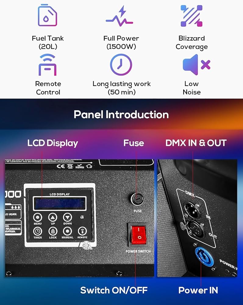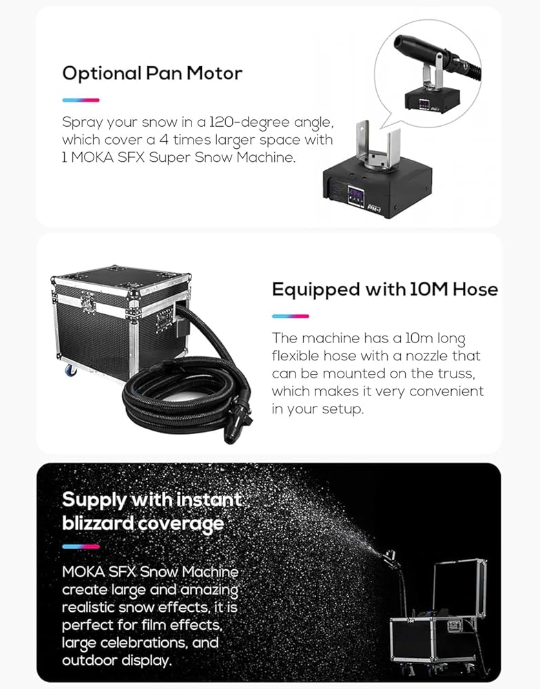 The snow machine is a must have to make your next gathering extra special and unique. Make a party your For: photographers, winter photo shoots (winter snow effect), parties, parade floats, stage performances; This model is a lightweight and portable device that is perfect for club effects, film sets and scenery where tranquil scenes and lifelike snow effects are required. Can be used for Halloween and Christmas stage effects.