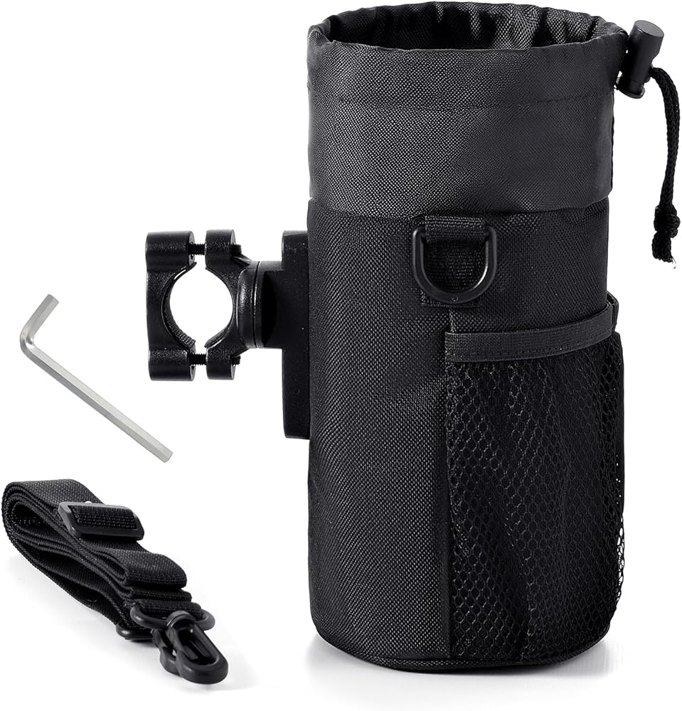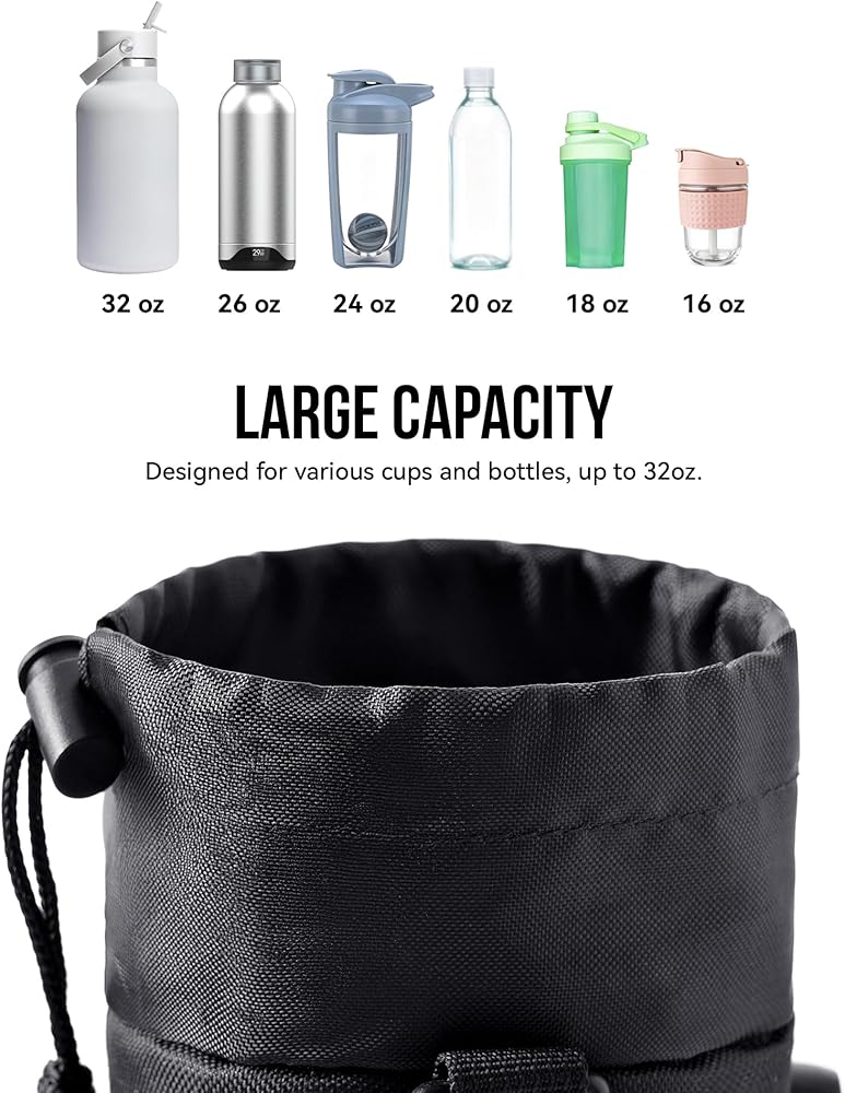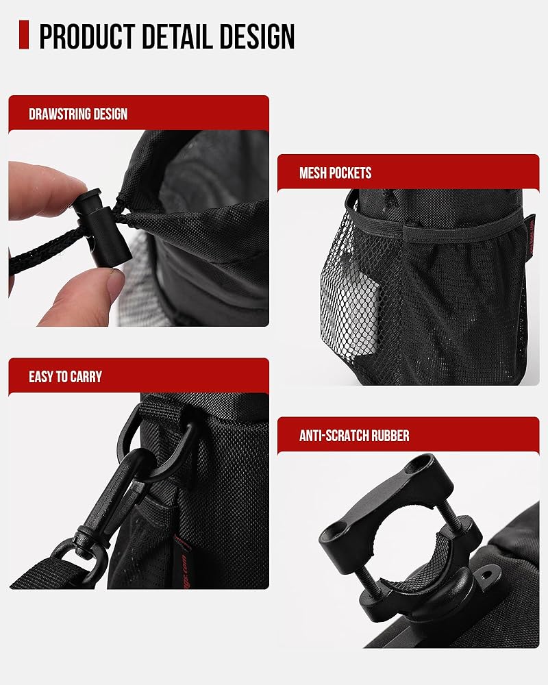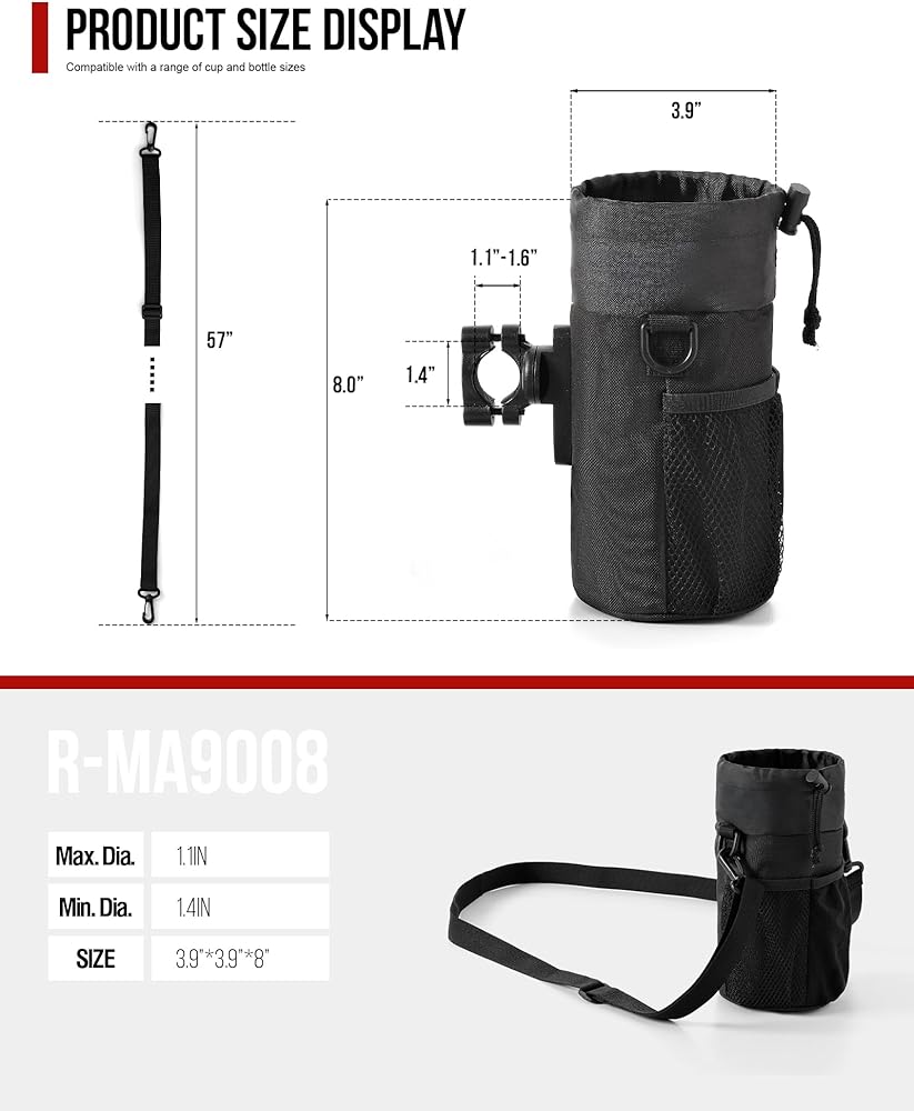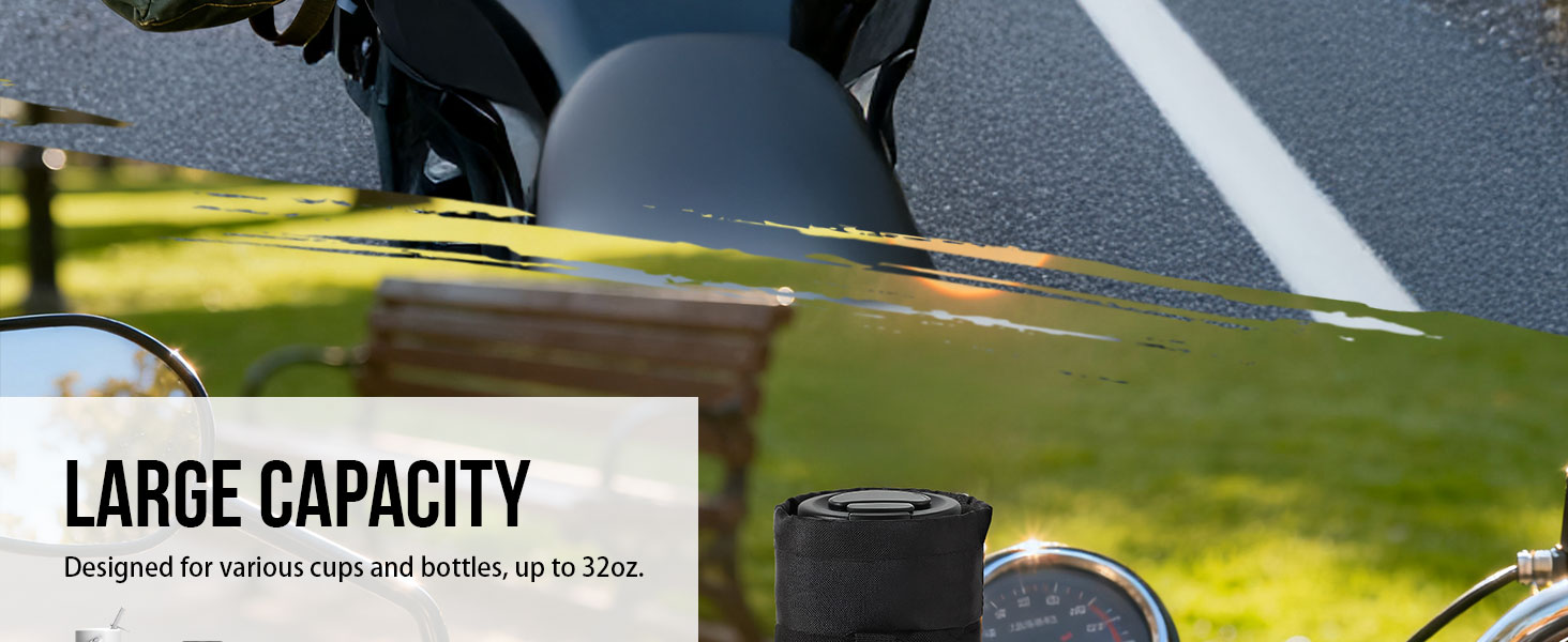【Large Capacity Design, Fits Multiple Cup Types】The motorcycle water bottle holder has a base diameter of 3.9 inches and a height of 8.5 inches. The top features a drawstring to adjust the opening size, making it suitable for most 12 to 32 oz cups and bottles, and compatible with a variety of beverages