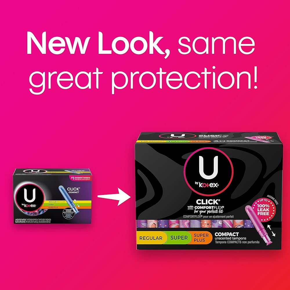 15 Regular. 10 Super. 5 Super Plus. With comfort flex for your perfect fit. Up to 100% leak free. Comfortably compact, powerful protection. Slim & Smooth: Designed to keep up with you. ComfortFlex technology moves with you for outstanding comfort. Made without fragrance. Pull until it locks into place. Tampon Absorbency Ranges: Regular: 6-9 g; Super: 9-12 g; Super Plus: 12-15 g. These absorbency ranges and their corresponding terms are required to be used by all tampon manufacturers to indicate the amount of fluid absorbed using a standard laboratory test. Use the standardized absorbency ranges and terms to make comparisons between tampons of all manufacturers. Choose the minimum absorbency necessary to control your menstrual flow in order to reduce the risk of contracting TSS. ubykotex.com. how2recycle.info. Get involved at: ubykotex.com. 1-800-335-6839 ubykotex.com. Consumer Services, Kimberly-Clark Corp., Dept. UBKFCM-30 PO Box 2020, Neenah, WI 54957-2020 USA. Everyone deserves access to period products. As the founding sponsor of the alliance for period supplies, U by Kotex makes millions of donations to ensure every person has the products they need to live fully and freely. Dispose in a trash receptacle. Dispose of properly. Regular: Made in Mexico. Super/Super Plus: Country of Origin Czech Republic, Finished in Mexico.