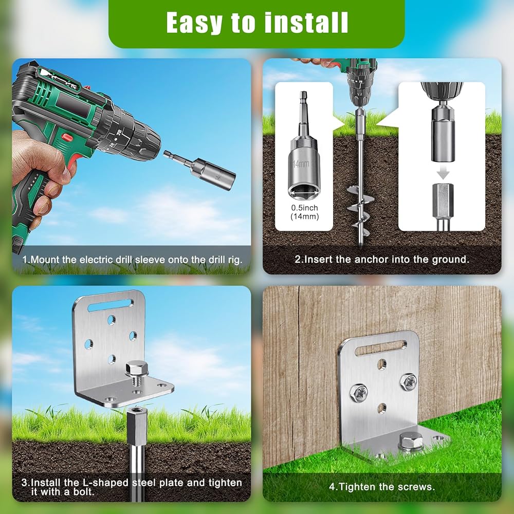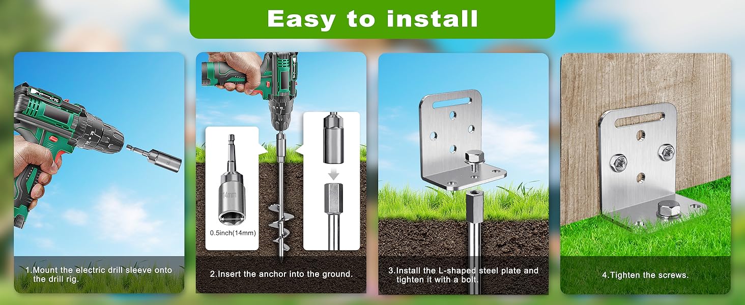 Easy to install: The canopy anchors set includes 4pcs 30" ground stakes anchor, 1pcs 0.55" electric drill sleeve, 4pcs L-shaped brackets and 8pcs screws. Mount the electric drill sleeve onto the drill rig and can start using. Used with a drill rig, it can be installed faster and more labor-saving.