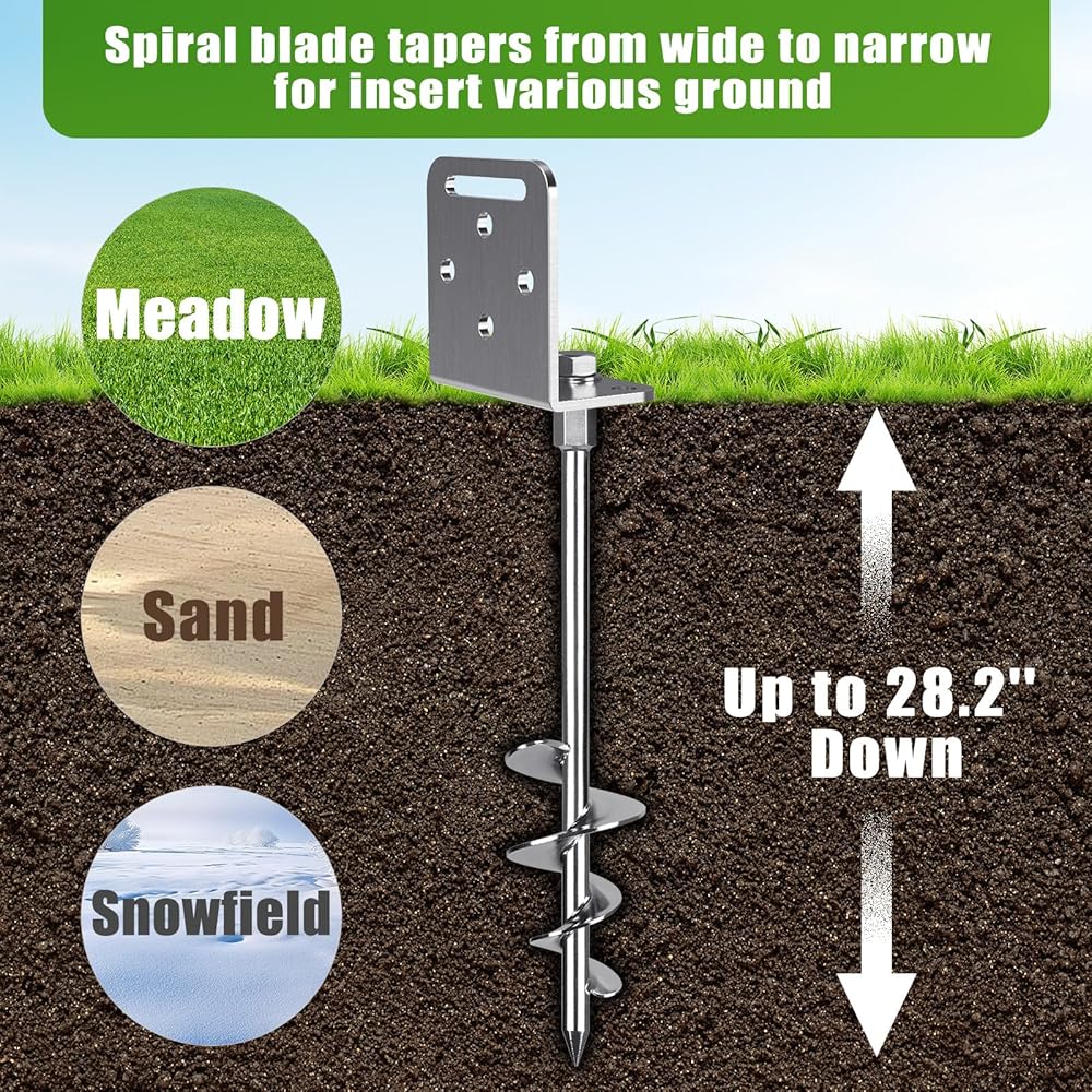 Multi-purpose: The 30" swingset anchors kit can help you fix swings, sheds, mobile home, campers, camping tents, trampolines, carport, soccer frame, fence, inflatable castles, fix boats, trees, and can also be used as a dog anchor. Used in conjunction with strap, it can prevent tents or sheds from being blown away by the wind.
