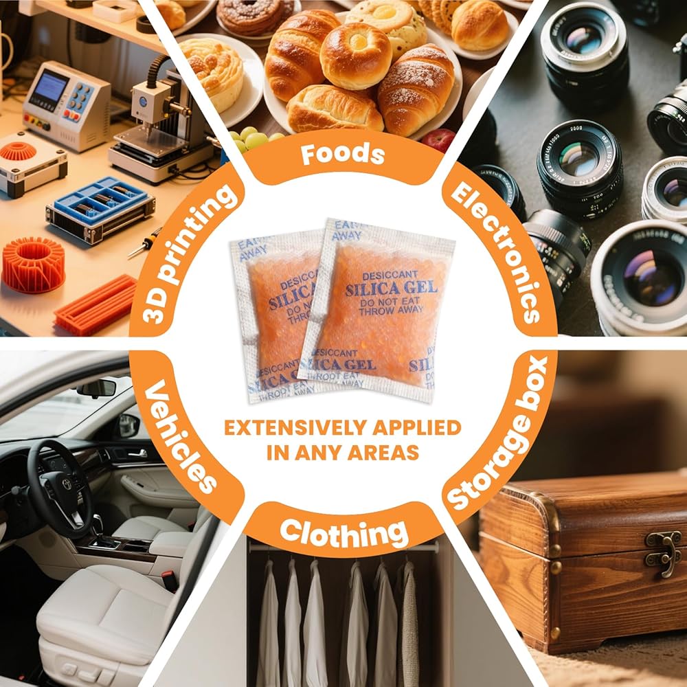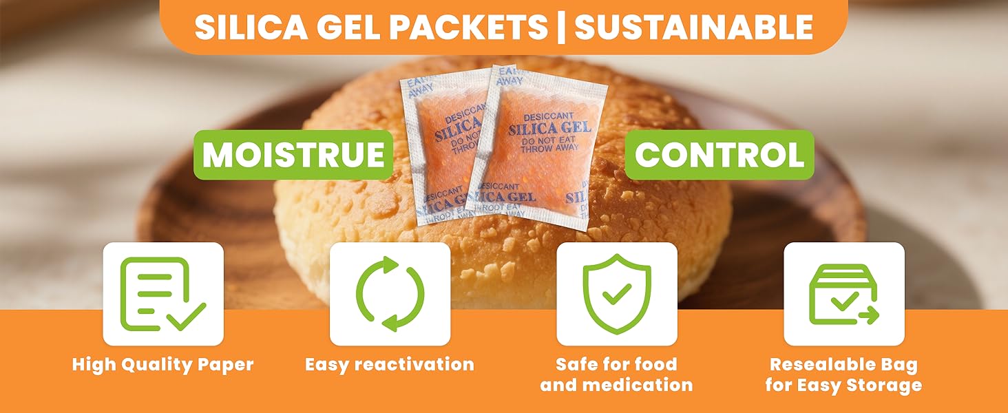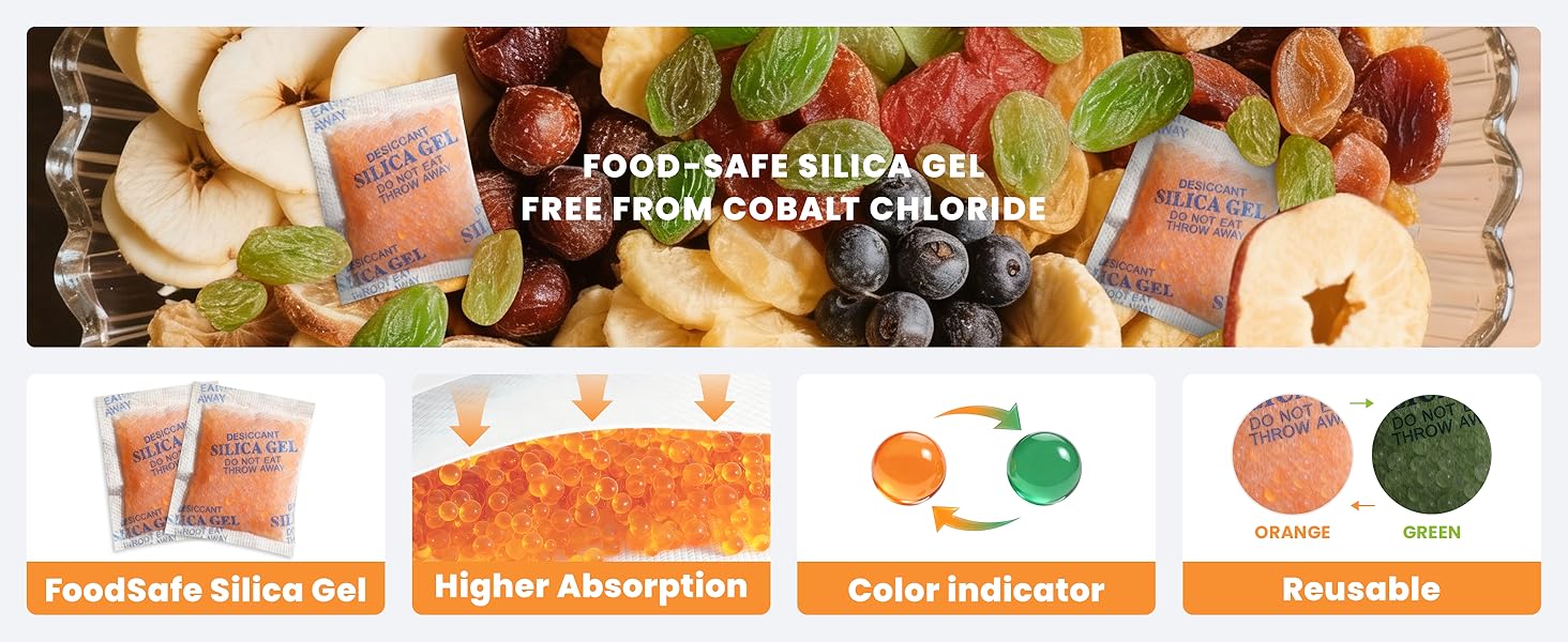 【Food-Grade & Safe Materials】Food-grade desiccant made from high-quality silica gel, safe for use with food, seeds, medicine, supplements, and pet food, effectively protecting everyday items from moisture.