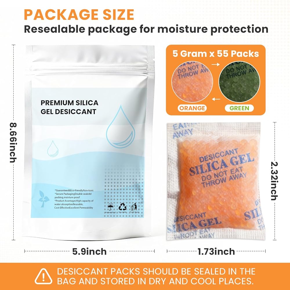 【Portable & Multi-Purpose Protection】Each 5g silica gel desiccant packet comes in a 50-pack value set, allowing flexible use to meet moisture control needs for food, seeds, vitamins, spices, pet food, clothing, shoes, cameras, electronics, cosmetics, books, and other valuables.