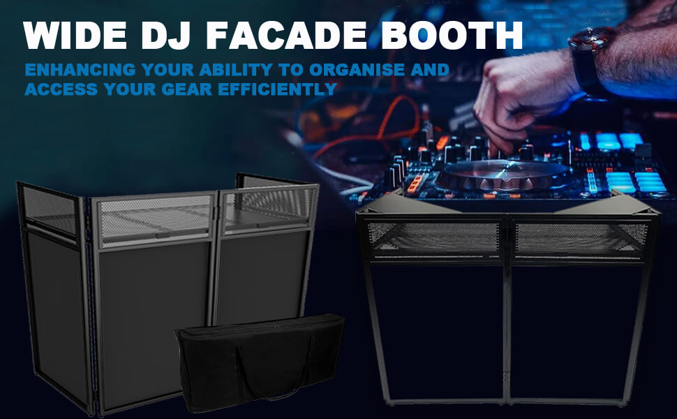 4️⃣ Foldable DJ Facade Booth with Professional Appearance This foldable DJ facade booth includes sleek black scrim panels that hide cables, power strips, and equipment from the audience. The clean look helps DJs maintain a professional stage appearance, making it ideal for wedding DJs, event DJs, and corporate performances.