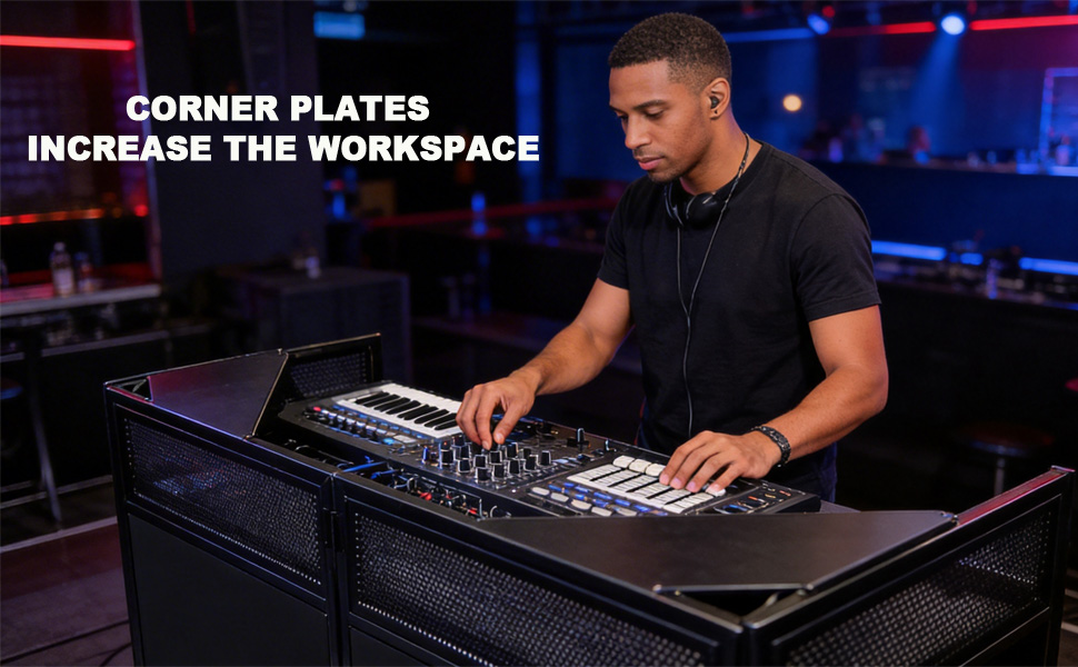 2️⃣ Unique DJ Booth with Dual Corner Panels Unlike a standard DJ booth table, this upgraded mobile DJ booth includes two metal corner panels that act as extra side tables for speakers, lights, or accessories. The extended layout keeps your DJ setup organized and efficient, while giving DJs more working space during live performances.