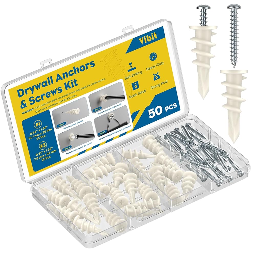 Vibit Self Drilling Drywall Anchors, Heavy Duty Wall Anchors for Drywall, Dry Wall Anchors and Screws Kit for up to 75 lbs, Plastic Sheetrock Anchors with #8 x 1 5/16" Screws, 50 Pcs