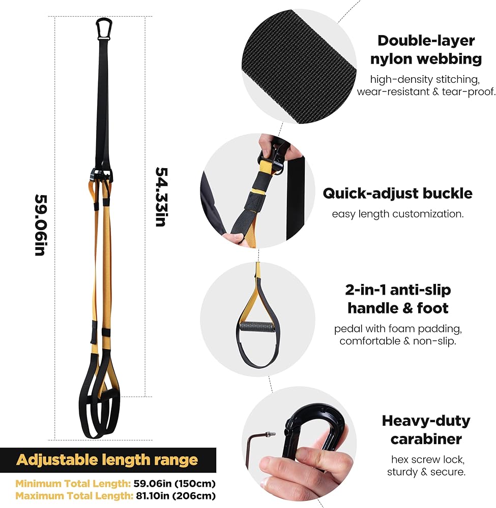 The matching suspension straps are made of high-density double-layer nylon fabric with reinforced stitching at key stress points to improve wear and tear resistance for daily resistance training. Equipped with one-click quick-adjust buckles, length can be easily changed without extra tools to fit different postures and difficulty levels. It suits users of all heights and fitness levels from beginners to advanced trainers. The nylon is sweat-absorbent, non-slip and easy to clean, staying soft and durable for year-round indoor and outdoor suspension training.