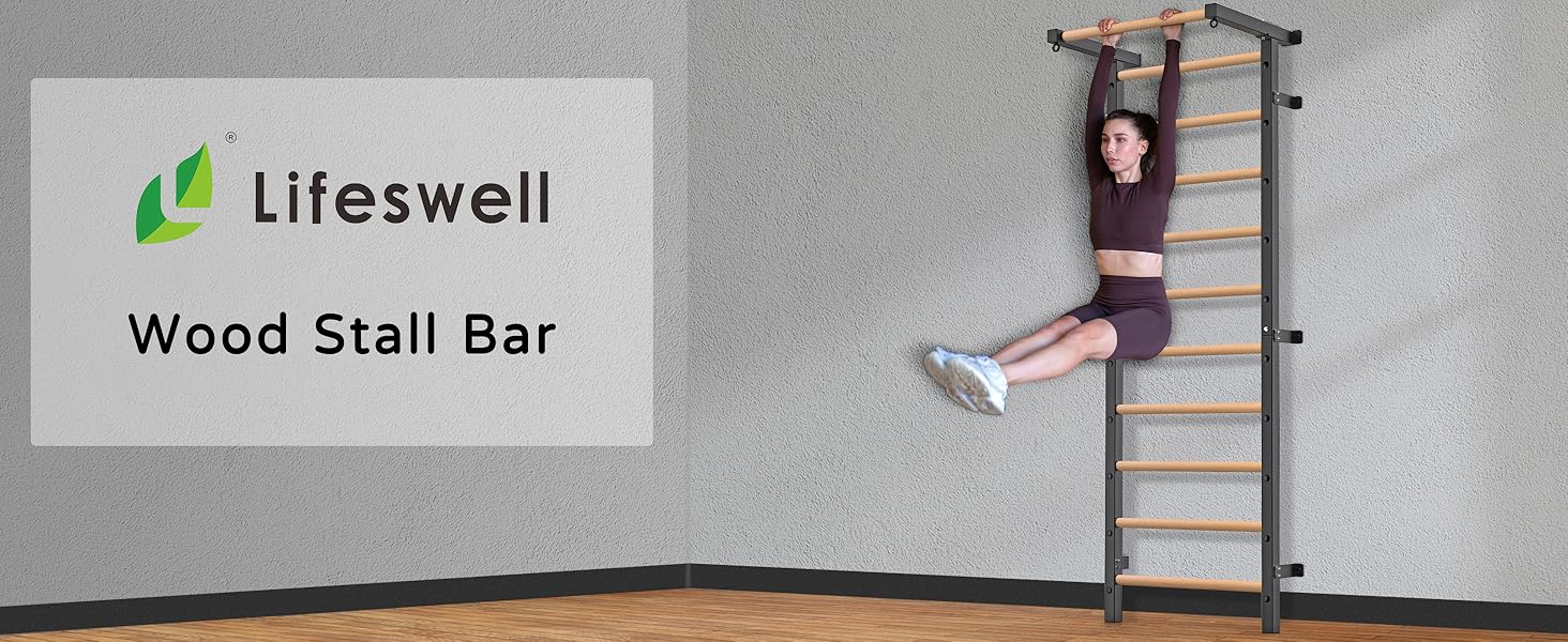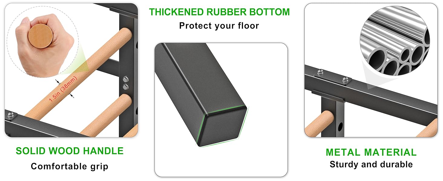 【SAFE AND COMFORTABLE】Our stall bar feature 1.5 inch solid beech wood handles with a smooth varnish finish, durable steel frames with a powder-coated finish, and a weight capacity of up to 330 pounds for a safe workout experience