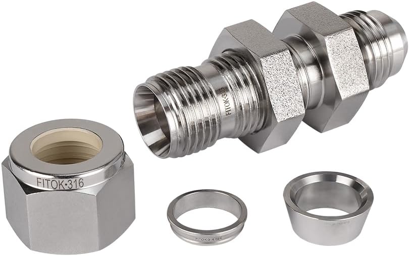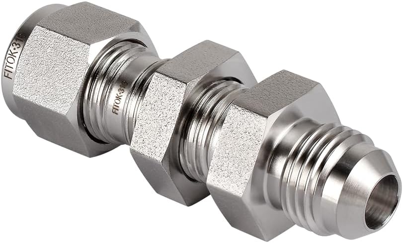 Fully certified to ASTM F1387 standards. Bulkhead male connector, also known as a through-wall fitting. Connection 1: 1/4" Tube OD. Connection 2: 1/4" Male JIC 37° Flare 7/16-20 straight thread. Dash size 4. Interchangeable with other major brands including Swagelok and Parker A-Lok.