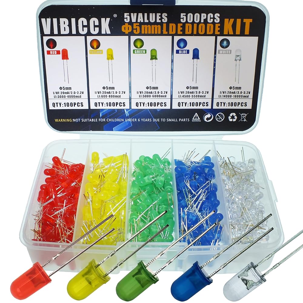 LED diode kit includes a total of 500 5mm LED beads, with 100 each in red, yellow, green, blue, and white, available in 5 different colors
