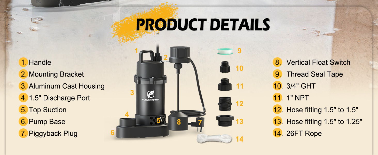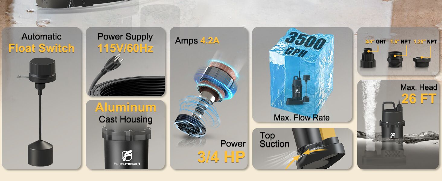 EFFICIENT DRAINAGE: 3/4 HP powerful motor offers a maximum flow rate of 3,500 GPH with 1-1/2" discharge hose horizontally. This sump pump has the ability to lift water up to Max. 26 feet of vertical height. Removing water to 2" of the surface by manual mode