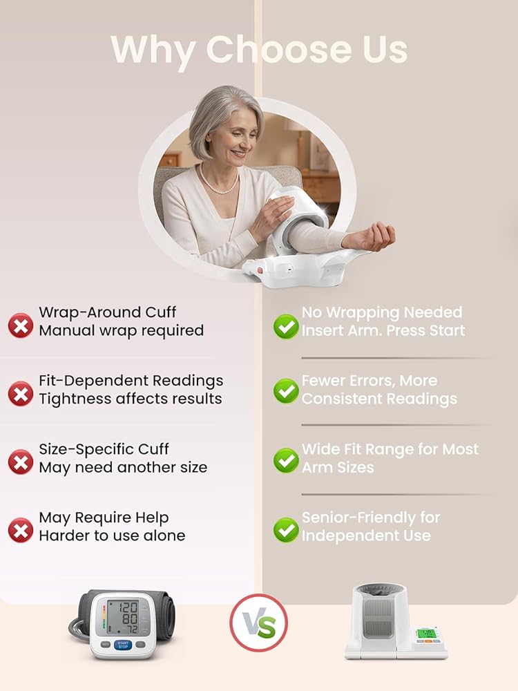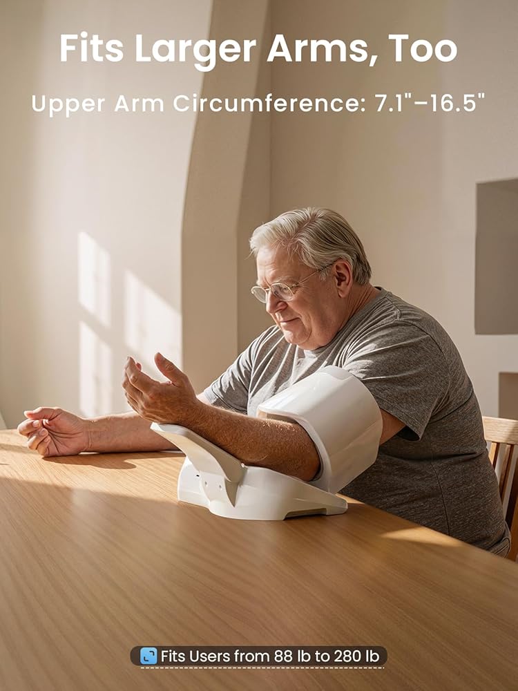 Auto-Fit Wide Range: This upper arm blood pressure monitor uses a comfortable cylindrical barrel design to auto-fit arms 7.1"–16.5", creating a secure, stable, even contact fit for different users. Unlike traditional wrap cuffs that can feel too tight/loose or pinch, it supports a more comfortable experience and consistent fit—ideal for shared family use across different arm sizes.
