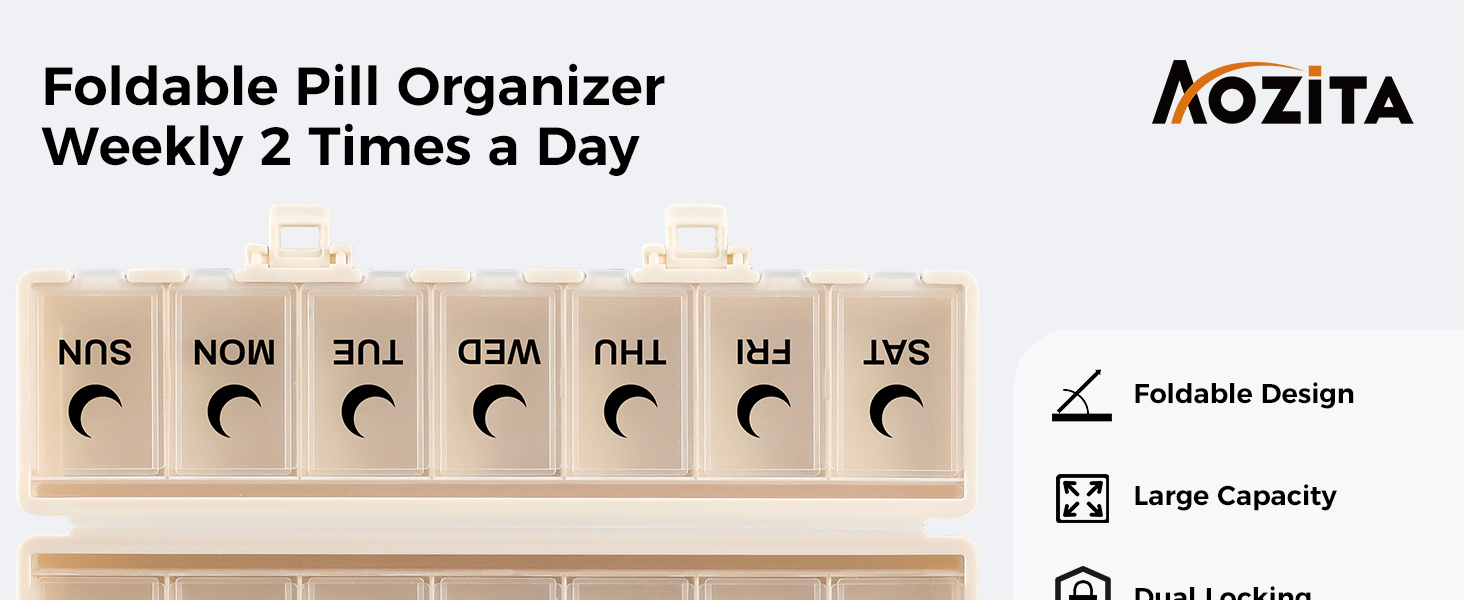 FOLDING DESIGN & DOUBLE-LOCK PROTECTION: This 7 day am pm pill box features a space-saving folding design, combining AM/PM compartments. The upgraded double-lock system ensures medications stay securely in place, preventing accidental spills during travel or daily movement.