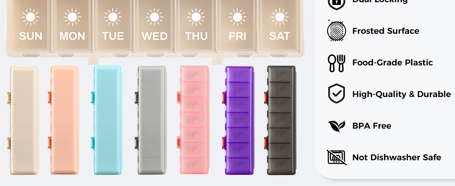 EASY TO OPEN: Specially engineered lids and locks offer just enough resistance to prevent accidental opening while remaining effortless to use. (This pill case is not suitable for dishwasher cleaning and is not resistant to high temperatures or freezing. Please hand wash with cold or warm water.)