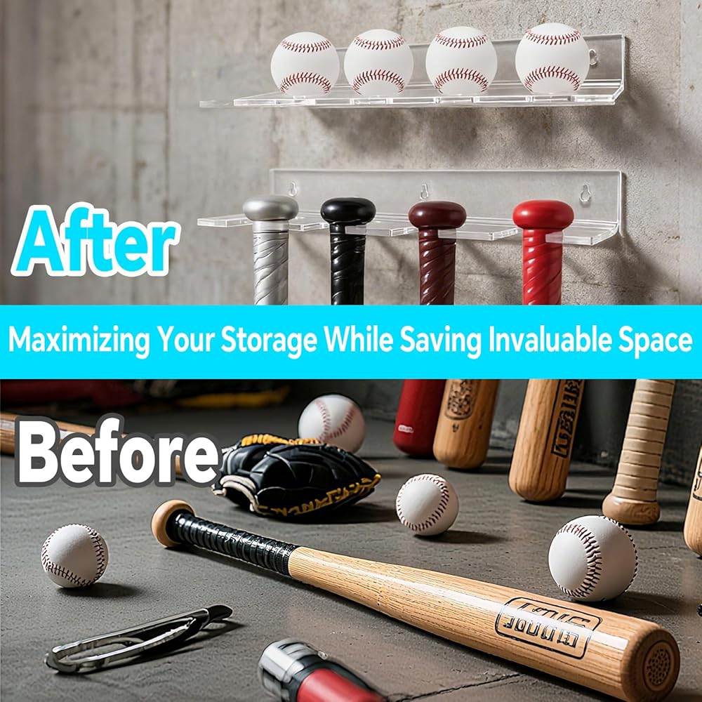 Acrylic Baseball Bat Holder and Baseball Display Wall Mount Floating Shelf, Vertical Hanging Organizer 4 Sets of Baseballs and Bats (Clear)