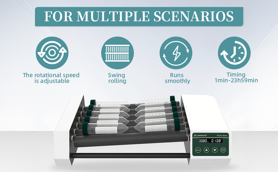 【Mixing Modes】Swing rolling(high/low axis)operation for efficient sample blending.Suitable for centrifuge tubes and vacuum tubes of various capacities, widely used in industrial, school and home laboratories