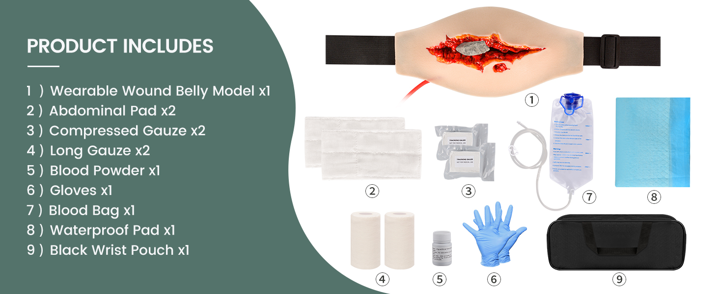 Complete Package for Realistic Training: This stop the bleed kit includes a wearable abdominal model, waterproof pad, blood powder, compression gauze, abdominal pad, long gauze, medical gloves, and blood bag, all packed in a portable black handbag. Perfect for stop the bleed training kit scenarios