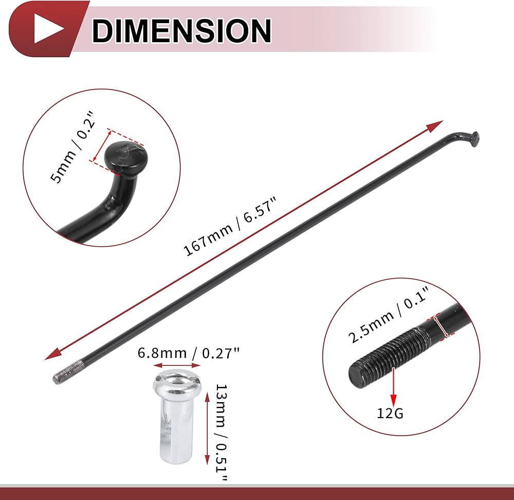 مواصفات المتحدث: حجم الخيط: 12 جرام؛ مادة التحدث: 45 فولاذ؛ اللون: أسود؛ قطر المتحدث: 2.5 مم / 0.1 بوصة؛ قطر الكوع المتحدث: 5 مم / 0.2 بوصة؛ طول المتحدث (بدون الكوع): 167 ملم / 6.57 بوصة؛ مقاس خيط الحلمة المتحدث: 12 جرام؛ مادة الحلمة المتحدثة: فولاذ كربوني مجلفن؛ قطر الحلمة المتحدث: 6.8 ملم / 0.27 بوصة؛ طول الحلمة: 13 ملم / 0.51 بوصة