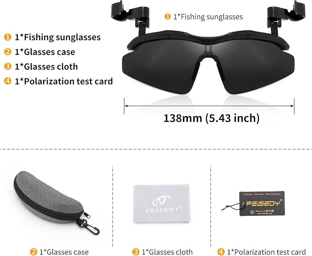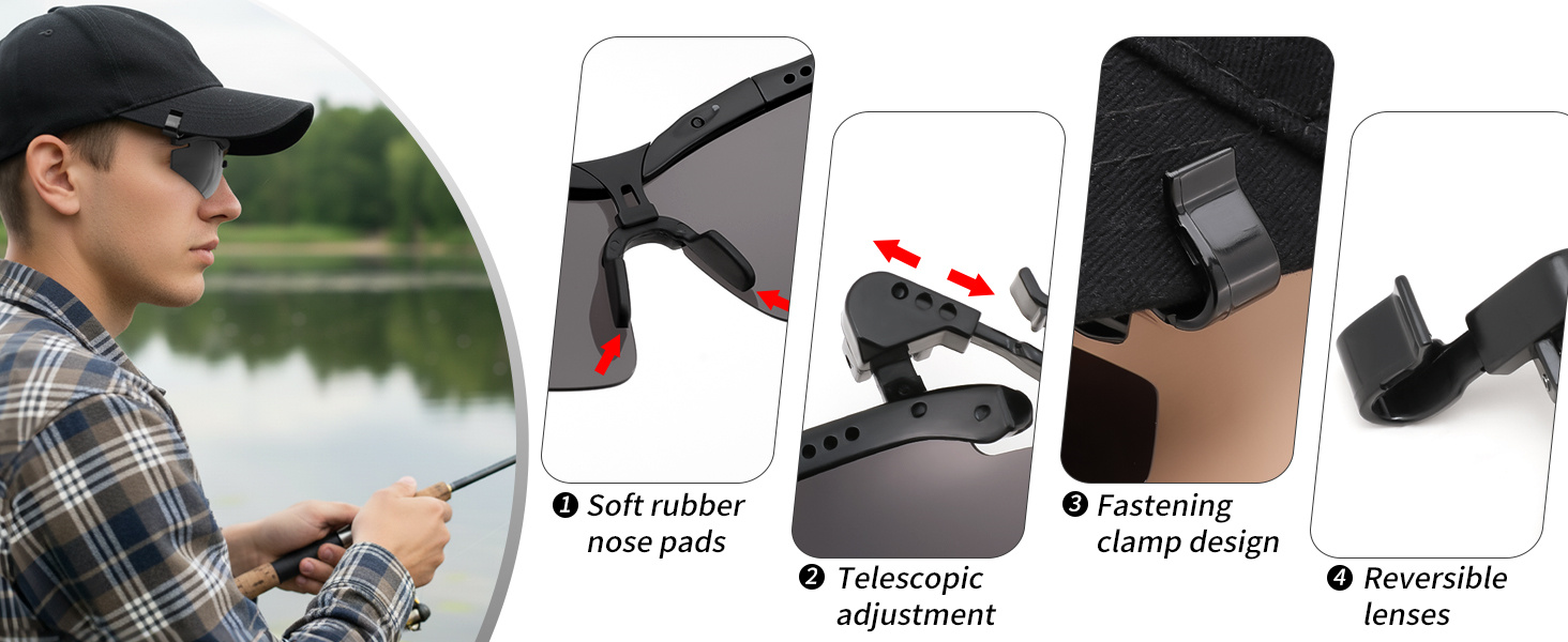 【Clip-on Design, Strong Stability】Unlike other polarized sunglasses, our clip-on sunglasses adopt a clip-on cap design on both sides, which supports the ability to firmly clamp the hat without falling off. When you don't need to wear it, just lift it up gently, and it will fit the brim of the hat so it won't affect your normal vision, and you don't need to find an extra place to store it.