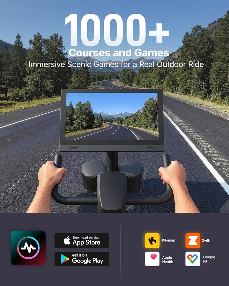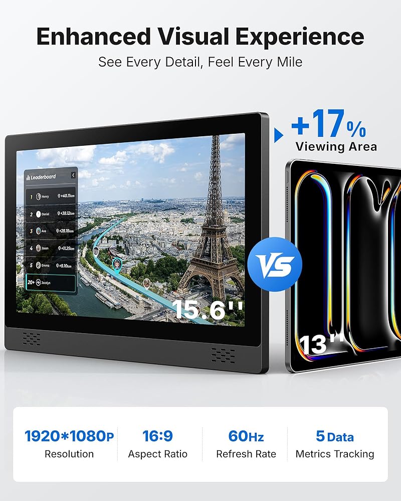 All-in-One Fitness Tracking: Enhance your workouts with 15.6'' full HD (1920x1080P) fitness bike screen, offering crystal-clear visuals while tracking 5 key metrics in real time: time, speed, mileage, calories burned, and distance. Stay informed and motivated with every ride. **Note: Currently incompatible with iPhone 17 series and Google phones.