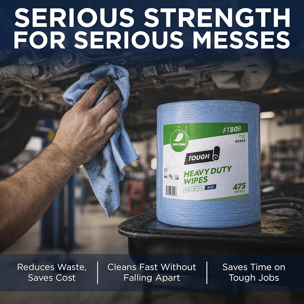 Fresh Towel FT80B Heavy Duty Wipes are designed to deliver reliable performance for a wide range of cleaning tasks. These heavy-duty cleaning wipes feature sheets measuring approximately 11.8" x 13" inches, providing generous coverage to help clean surfaces efficiently. Built with durability and absorbency in mind, these absorbent wipes resist tearing while effectively lifting dirt, grease, and liquids from surfaces. The absorbent structure helps improve efficiency by allowing you to clean more with fewer sheets, making them a practical solution for both residential and workspace environments. These disposable cleaning wipes are suitable for kitchens, garages, workshops, offices, and other high-traffic areas. From wiping down countertops and appliances to cleaning tools and equipment, they provide versatile functionality for a variety of cleaning needs. Packaged as 1 roll of 475 sheets, these industrial cleaning wipes offer a long-lasting and convenient cleaning solution. Keep them within reach for quick, effective cleanup whenever you need it.