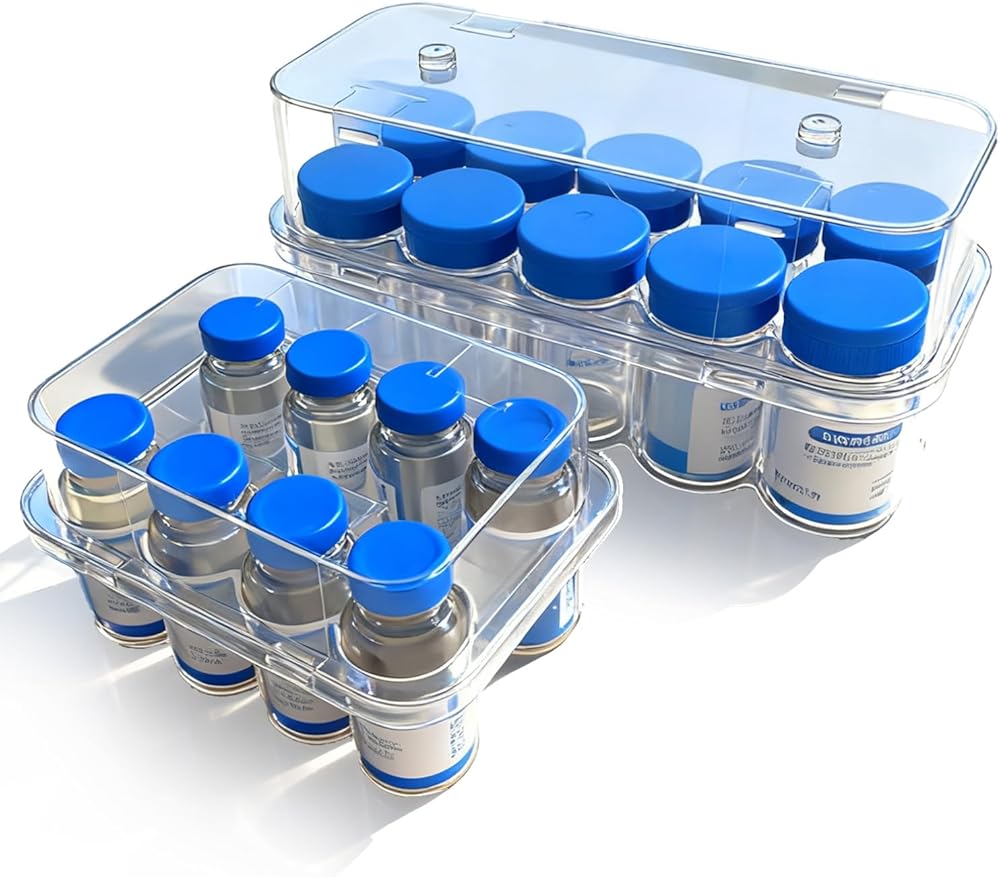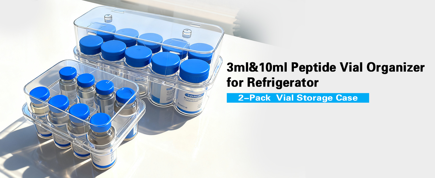 2pcs Peptide Case for Fridge, Vial Holder for Refrigerator, Holds 10ml &1-3ml Vials, Click-Closure Stackable Organizer for Insulin/Peptides/GLP-1, Semi-Transparent