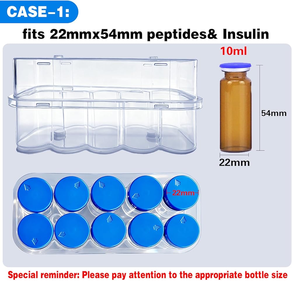 Portable & Travel-Friendly – Lightweight and peptide travel case , Two-Size Set for Different Vials – Includes a peptide case for fridge for 10mL vials (22mm×54mm) and a vial holder for refrigerator for 1–3mL vials (16mm×38mm), covering all your peptide storage needs.