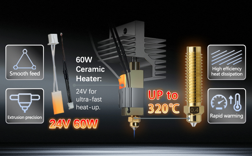 Ceramic Heating + Bimetal Nozzle: A 24V 60W 0.4mm ceramic hotend for Centauri Carbon ensures rapid heat-up, while the 0.4mm bimetal nozzle (withstand up to 320℃) offers superior heat transfer and wear resistance. Compatible with 1.75mm PLA/ABS/PETG/TPU for smooth extrusion