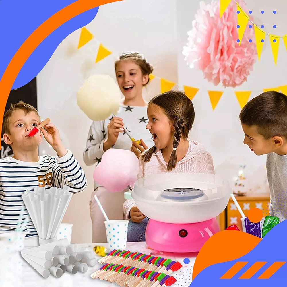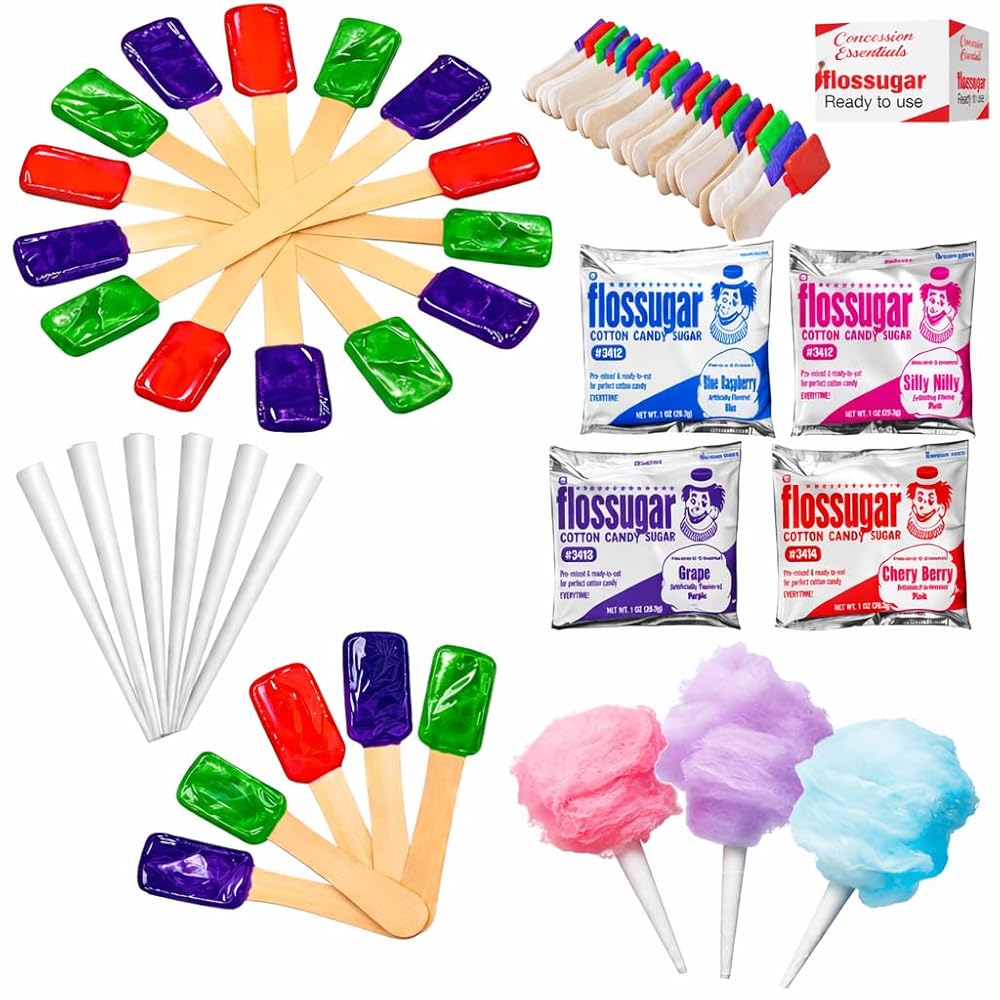 Transform any event into a magical carnival experience with this complete cotton candy kit! Perfect for parties, fairs, and concession stands, this comprehensive set includes 100 classic cotton candy cones and four delightful 8-ounce packs of cotton candy sugar in Cherry, Grape, Pink Vanilla, and Blue Raspberry flavors. As a bonus, the kit comes with 54 flavor-enhanced spoons in Cherry, Grape, and Sour Apple to add an extra burst of sweetness to your treats. Whether you're a seasoned cotton candy maker or just starting out, this kit provides everything needed to create fluffy, colorful confections that will delight guests of all ages. The pre-portioned sugar packs make it easy to create consistent, delicious results every time, while the sturdy cones ensure perfect serving presentation. Ideal for both commercial concession stands and home cotton candy machines.