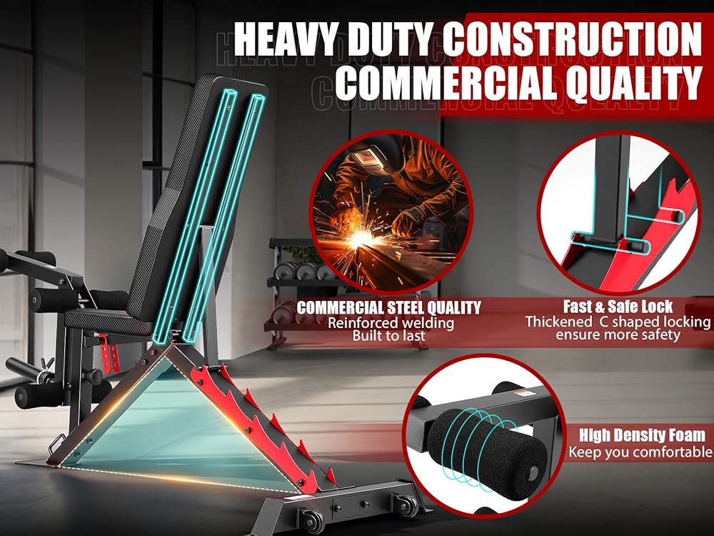 【Heavy Duty Commercial Gym Quality】 This workout bench features a frame constructed with 1.5MM newly upgraded commercial thickness steel, enabling the strength training bench to achieve a 1200 lbs weight capacity and provide excellent longevity during high intensity workouts.