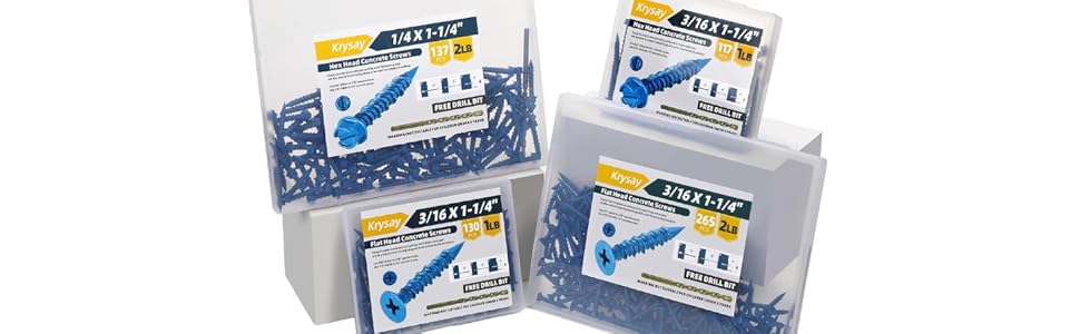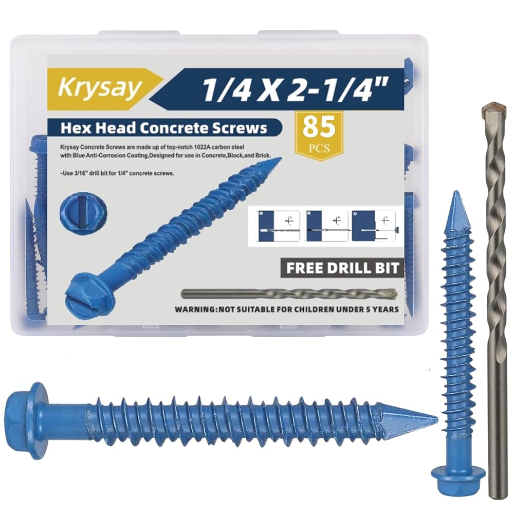 Concrete Screws With Drill Bit:You can get 85Pcs concrete screws, included 1 drill bits are a nice addition,1/4 x 2-1/4 Hex head phillips concrete screws,Meets most of your needs.