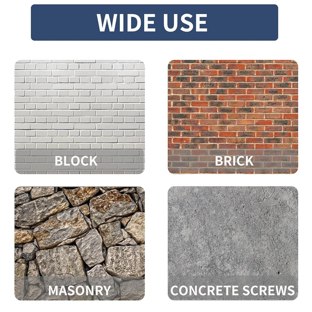 Widely Applications:Concrete screws are ideal for use in concrete, masonry, mortar Walls,cement, blocks, and bricks cinderblock,stucco materials, such as secured and anchoring shelf, metal art,hooks,electrical box,solar lights,foam board,grab bars,conduit, cameras, antennas and brackets