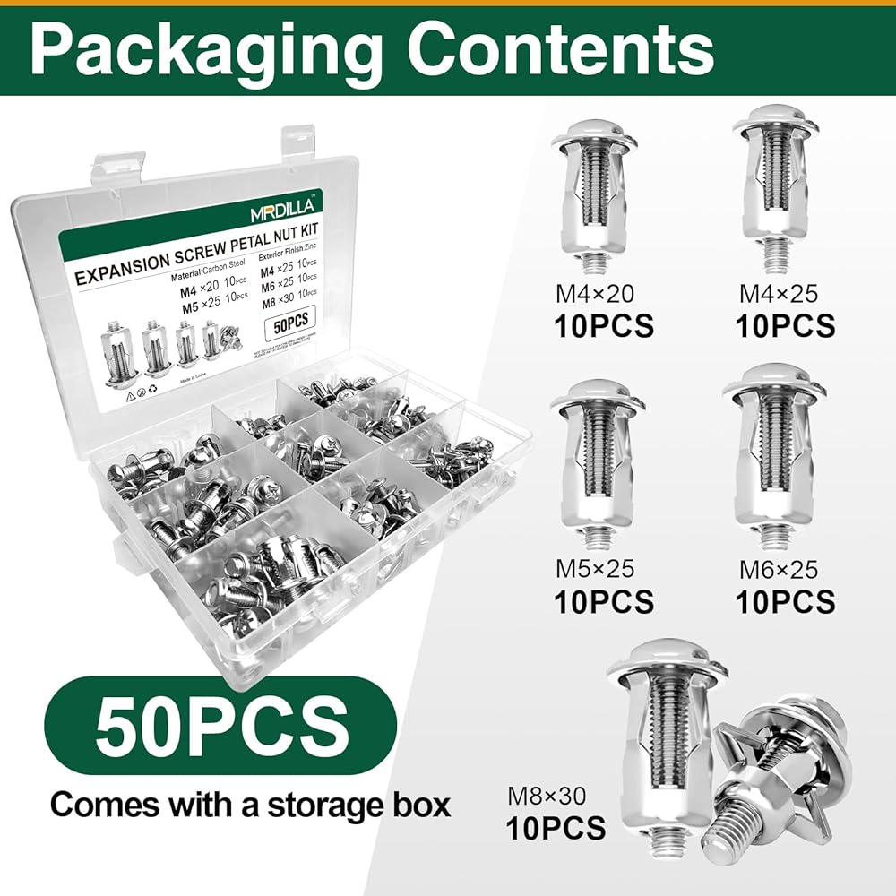 50PCS Expansion Screw Petal Nuts, M4-20, M4-25, M5-25, M6-25, M8-30 Jack Nut Kit with Metal Petal Screws for License Plate Installation, Hollow Wall, and Billboard