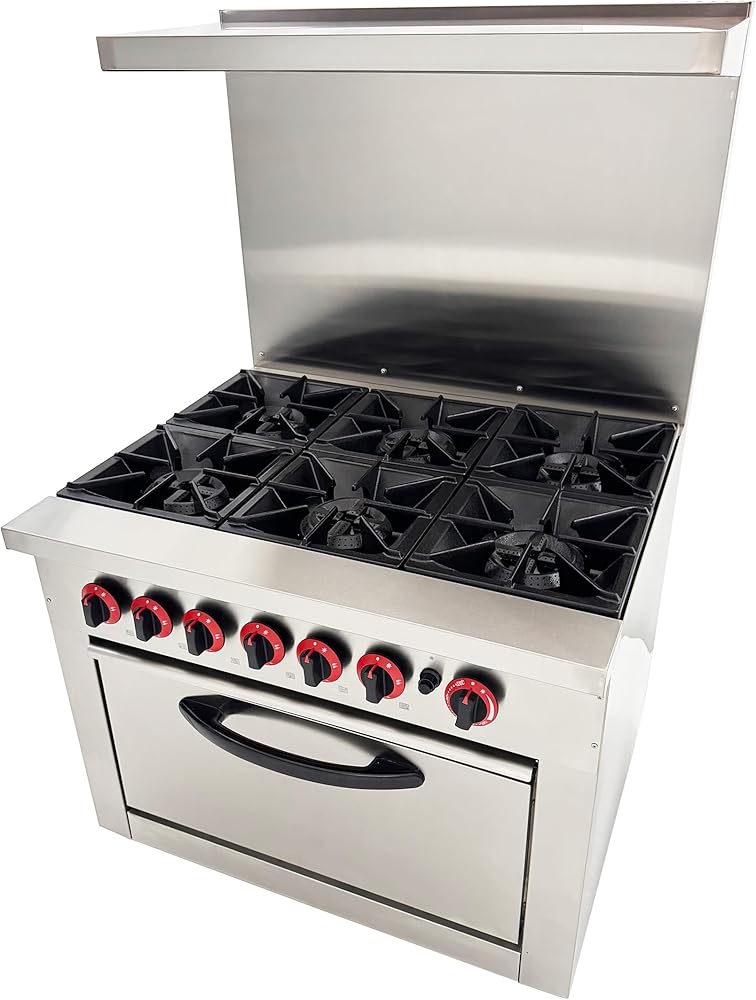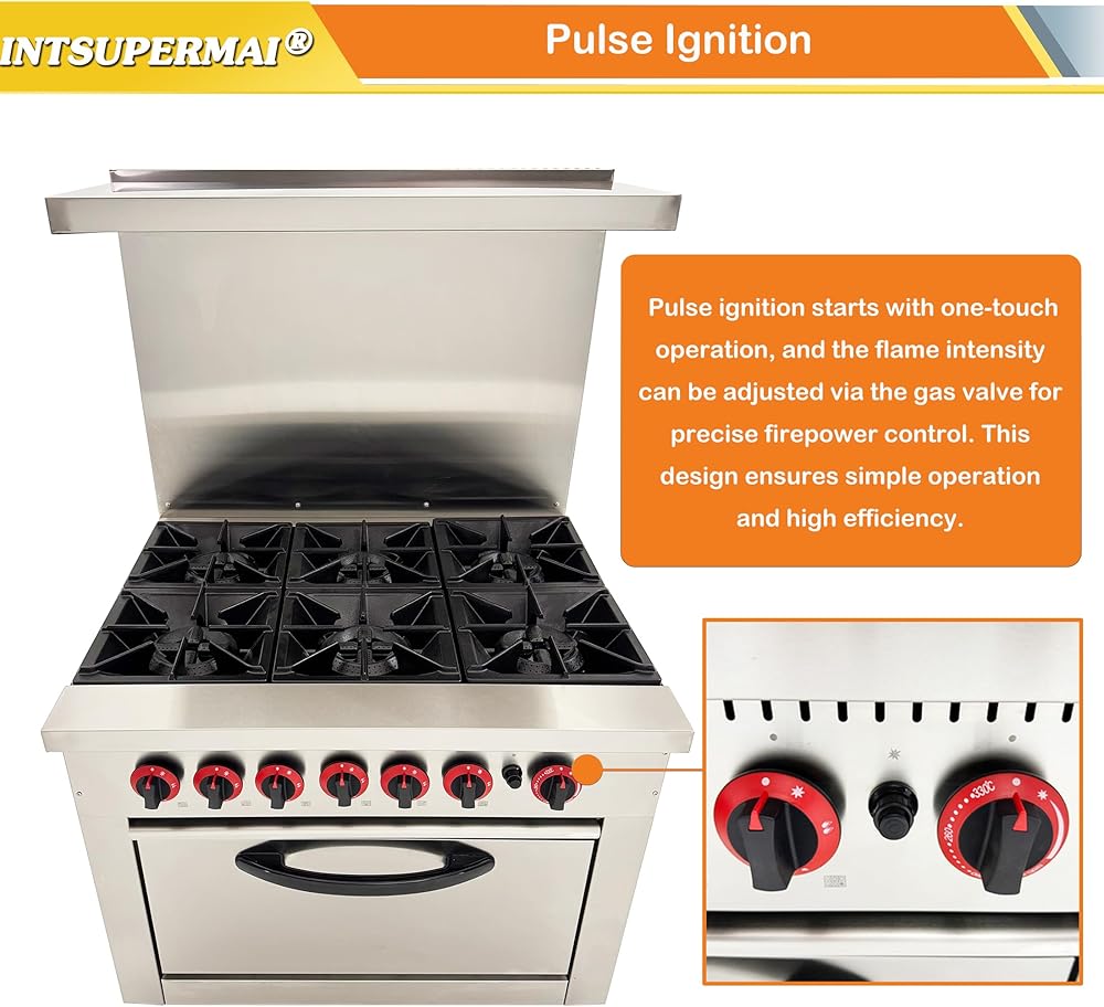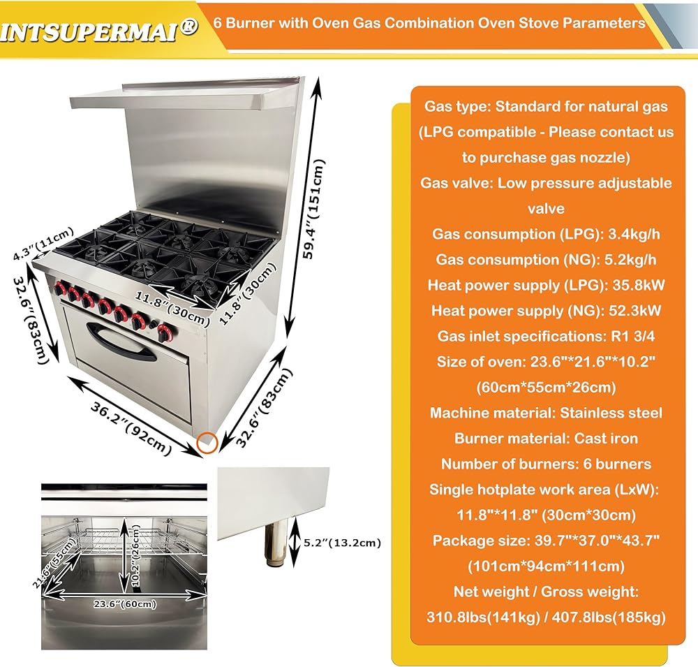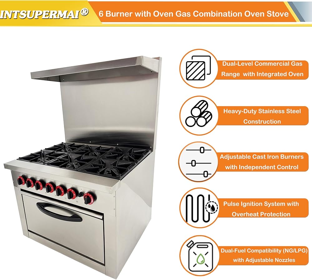 INTSUPERMAI Heavy-Duty Commercial Gas Range with 6 Split-Level Burners & NG/LPG Dual Fuel - Stainless Steel Clay Pot Stove for Tea Houses, Fast Food Kitchens, Restaurant W/Oven & Overheat Protection