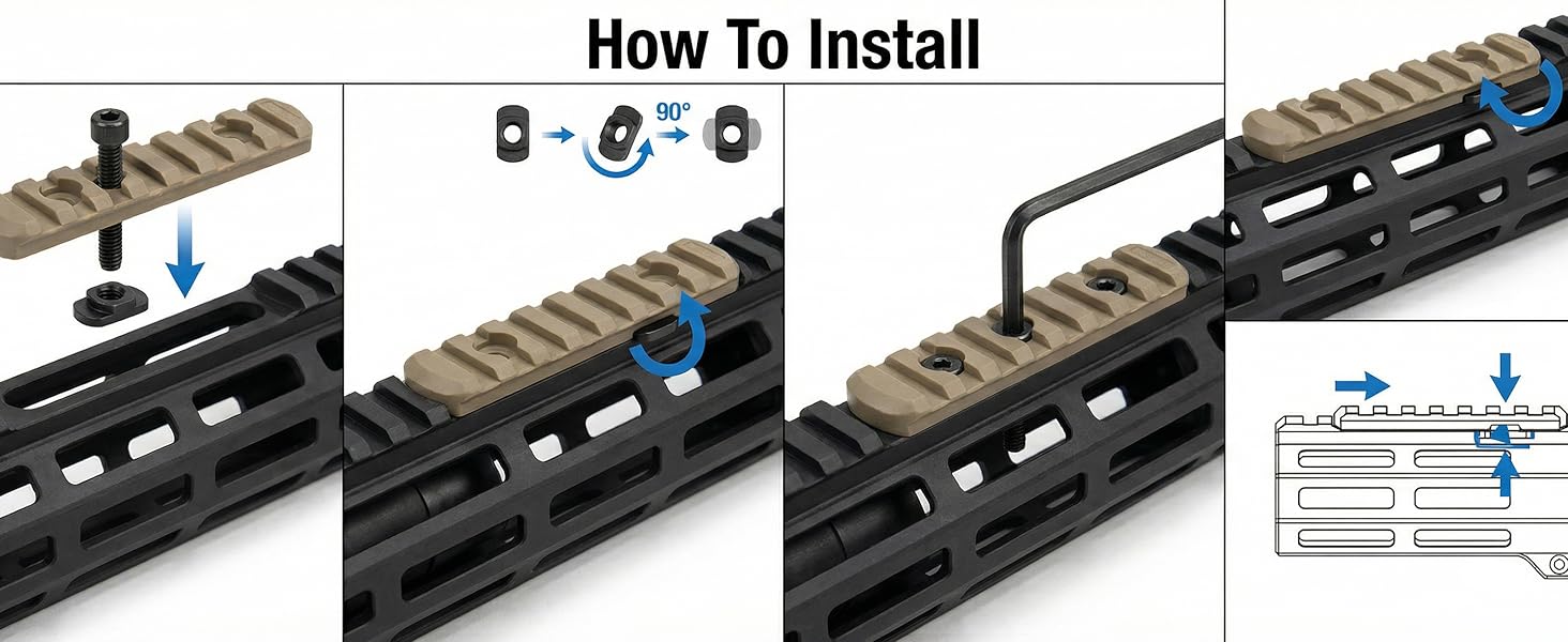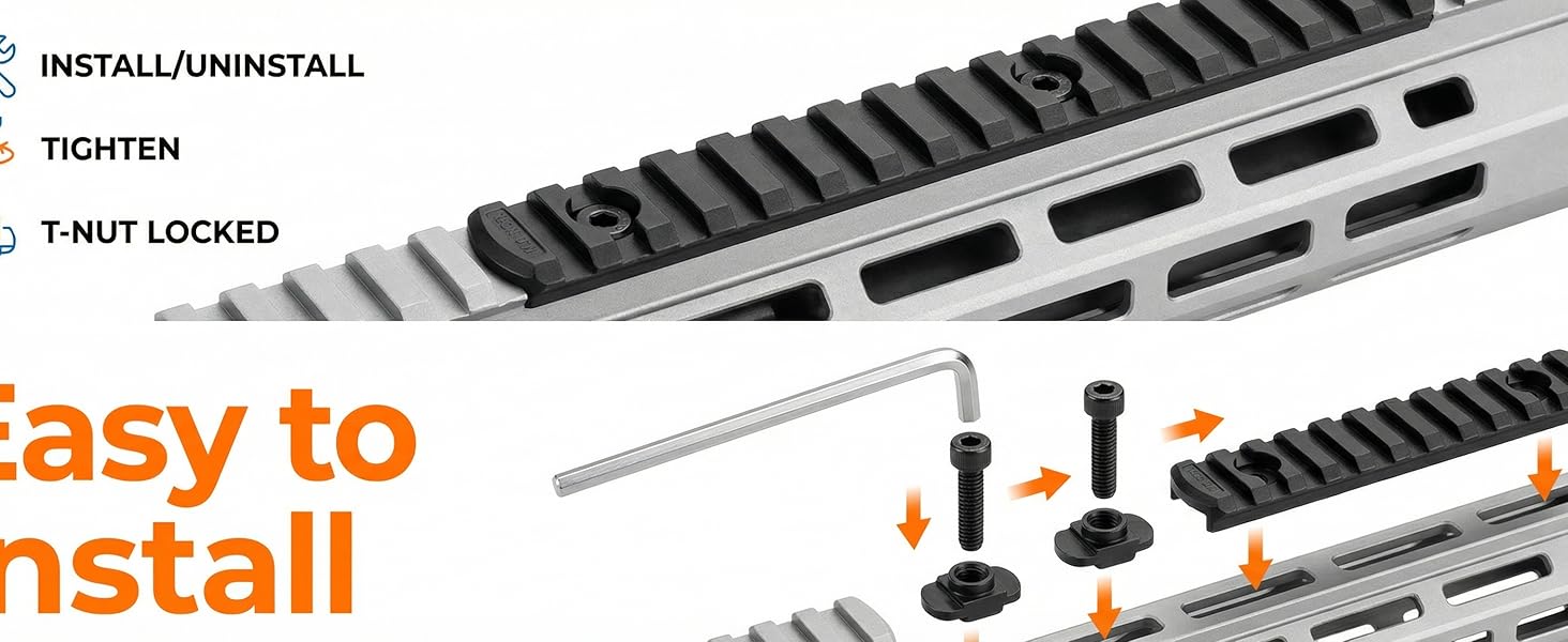 Universal Rail System Compatibility, Ready to Install Out of the Box:Expertly engineered for all standard rail mounting systems, it fits perfectly without additional modifications. The bottom protrusion anti-slip design securely locks into M-LOK slots, effectively preventing rail section slippage or detachment during tactical use for maximum stability.