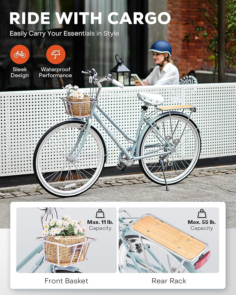 Load Up, Ride On: Wherever your journey takes you, the 11 lb front basket and 55 lb rear rack of the road bike ensure you're always equipped. Stash your laptop bag or gym essentials in the front basket and secure bulkier items on the rear rack