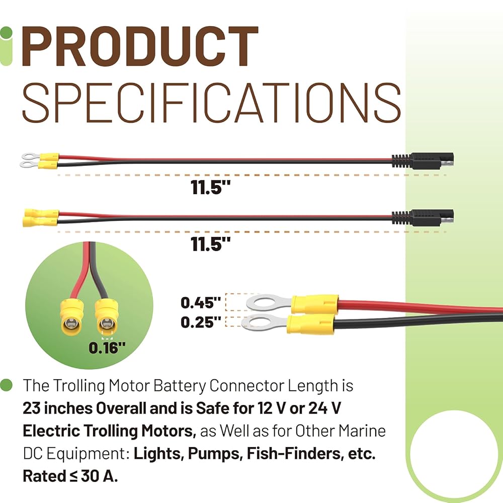 The 16 AWG marine connector is rated for up to 15A, providing stable power for LED lights, bilge pumps, fish-finders, and radios. Not suitable for high-amperage devices such as trolling motors.