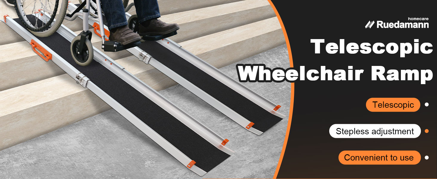 5FT Wheelchair Ramp: Our 5-feet adjustable wheelchair ramp is designed for steps up to 12" high. Product size: 60" (L) x 8.3" (W). Note: usable inside width is 6.7". Supports up to 600 lbs. This telescopic ramp serves as a portable wheelchair ramp for doorways, with a 2" edge height for safety