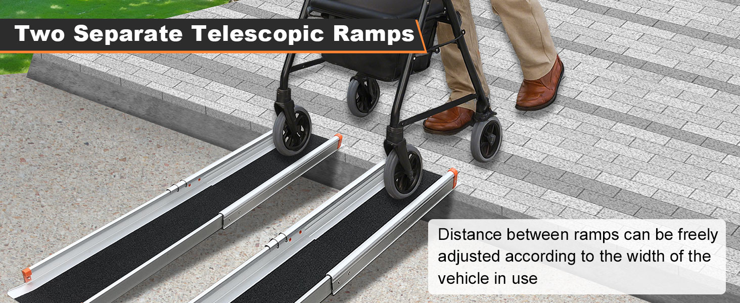 Two-Piece Wheelchair Ramp: Unlike traditional one-piece ramps, this two-piece aluminum ramp allows you to freely adjust the width to fit different wheelchairs. Each piece can also be used separately, making it a versatile portable ramp for various needs. (You can add straps to secure the wheelchair ramp and measure the distance in advance to reduce adjustments when traveling)