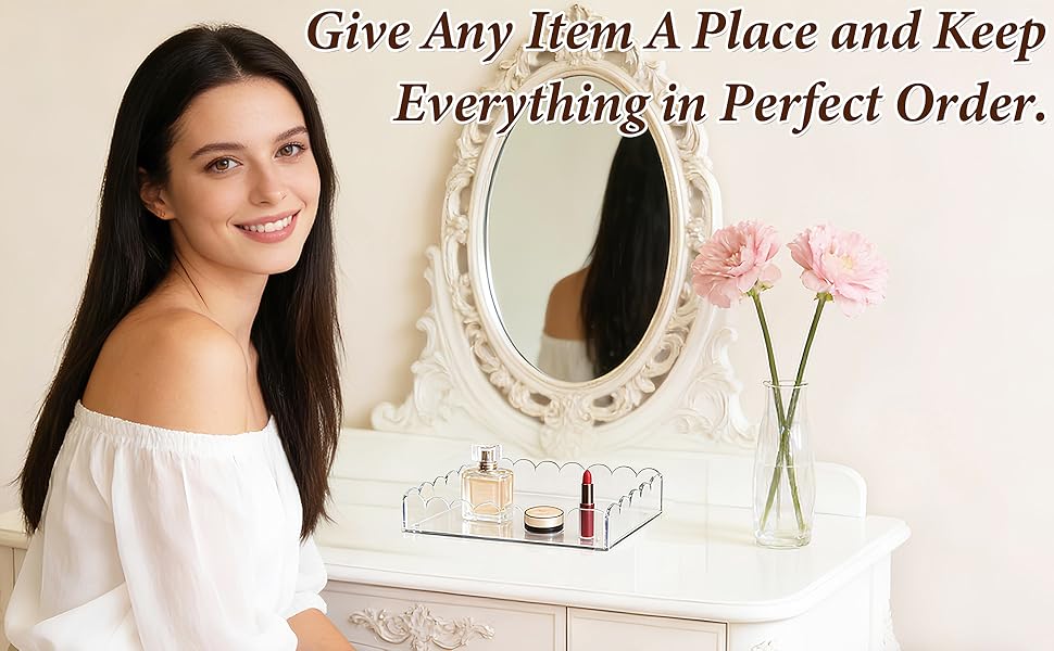 Thick Crystal-Clear Acrylic Construction: Elevate your space with the elegant acrylic trays for display is made from sturdy highly transparent material. This scalloped tray offers a modern and luxurious feel, providing a sophisticated display platform for perfumes, jewelry, or remote controls without visual clutter