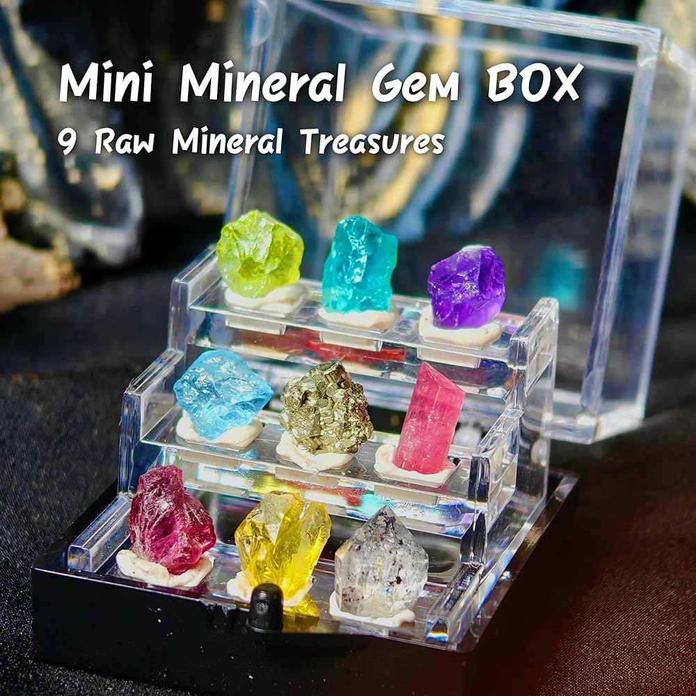 9 Rare Natural Gemstone Collection Gift Box-Peridot, Apatite & 7 Exquisite Minerals-Square Acrylic Tiered Display Case - Ideal Birthday & Christmas Gifts for Mineral Enthusiasts,Geography Enthusiast