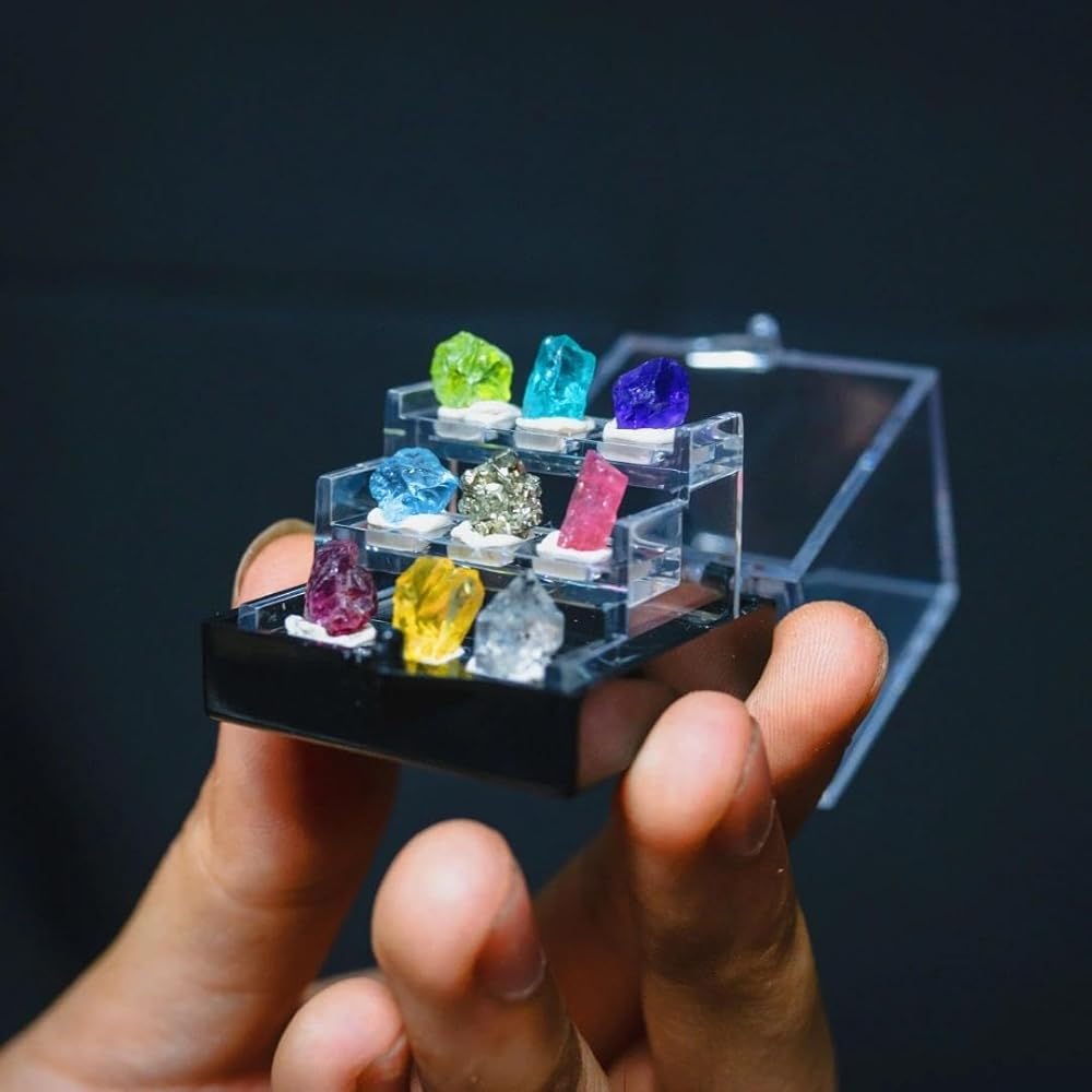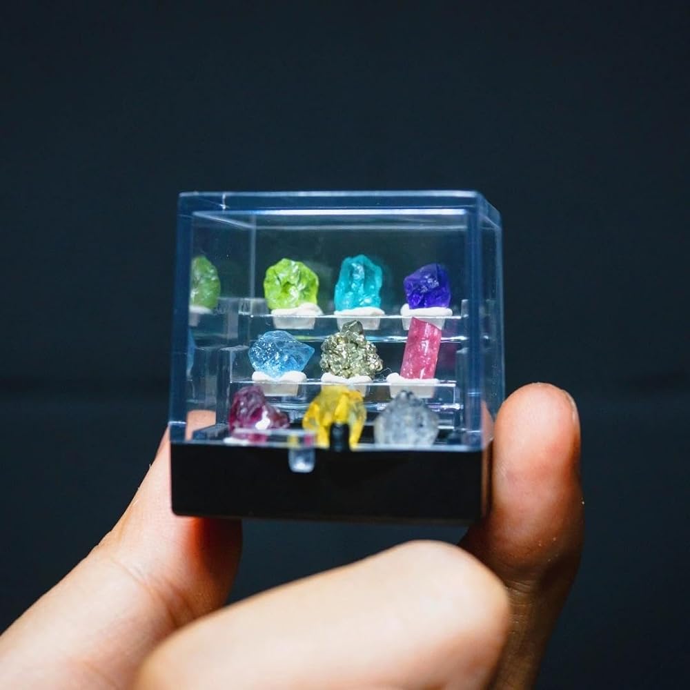 • Secure & Elegant Display:Gems are safely affixed with reusable adhesive to a custom 3-tiered square acrylic display case (1.38 inches in length), allowing for easy removal to examine each stone up close. The clear acrylic showcases the gemstones' vibrant colors and unique formations.