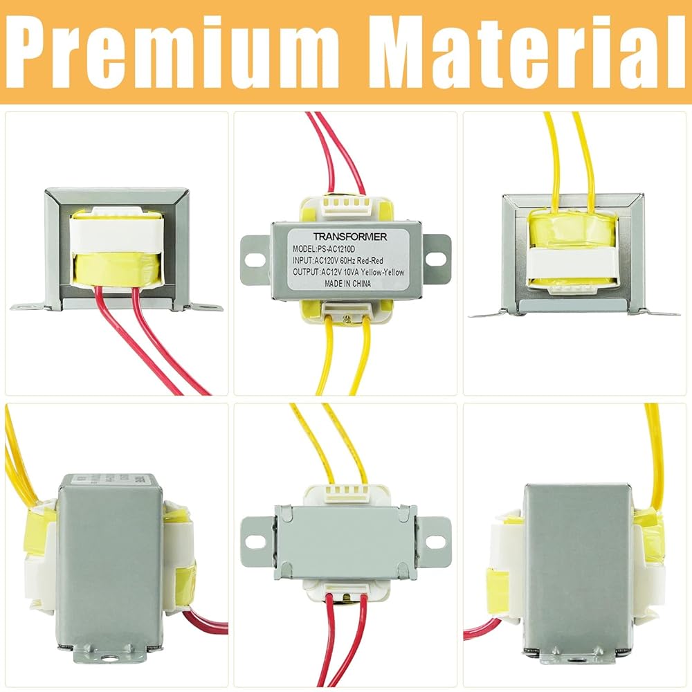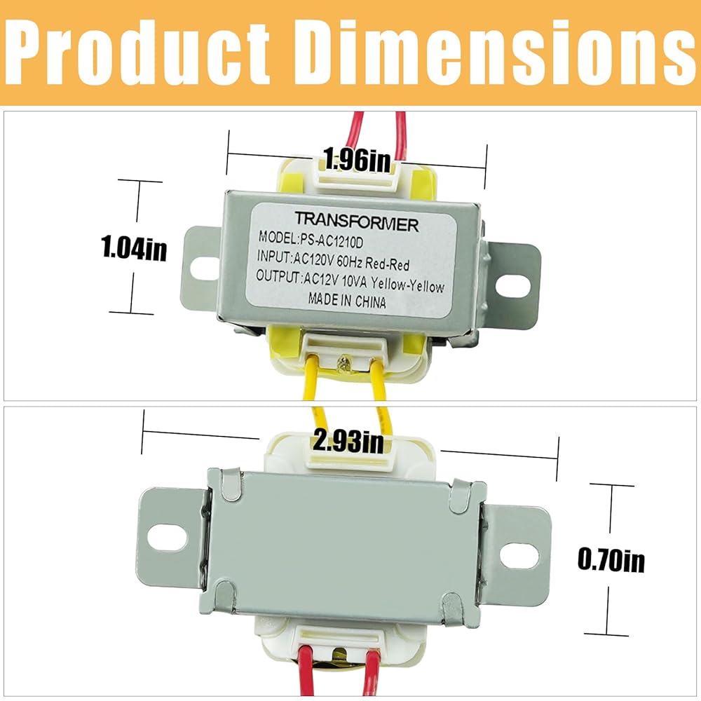 Specifications & Load Capacity: Please observe the technical parameters for proper use: Connect the Red wires for the 120V 60Hz input and the Yellow wires for the 12V output (no-load voltage). The transformer has a maximum power rating of 10VA; ensure your connected load does not exceed this limit to avoid overloading the unit