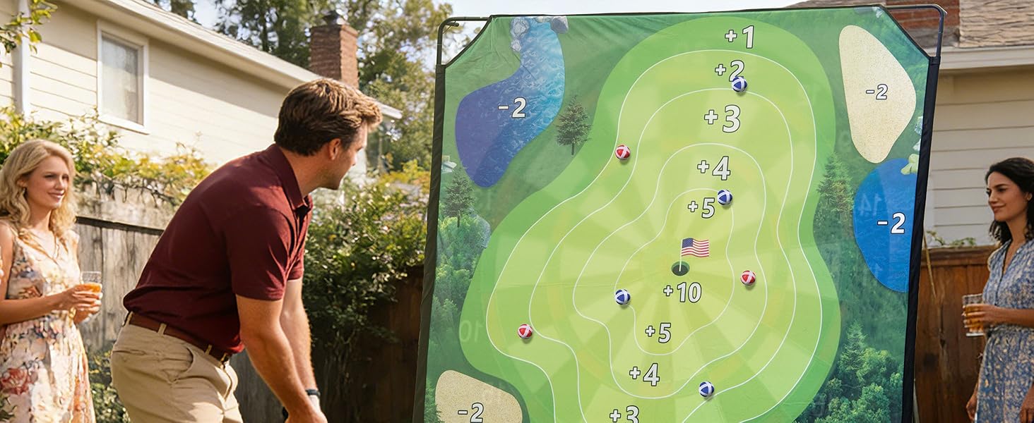 【Go for the Win】Each player takes a turn chipping their ball to the mat trying to hit the marked scoring area to get the most points. Shoot for the center for the most points. Just beware of the sand traps and water,etc. Those are all points lost.