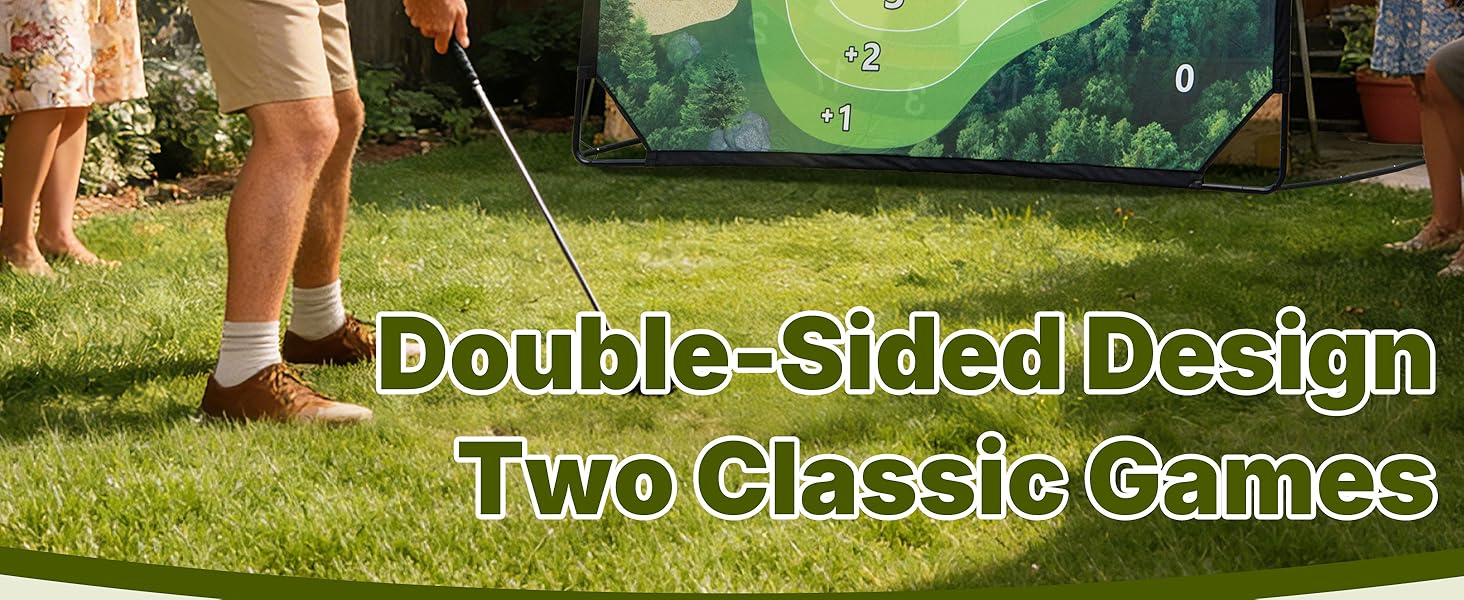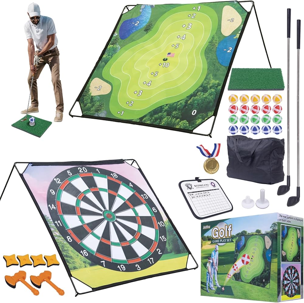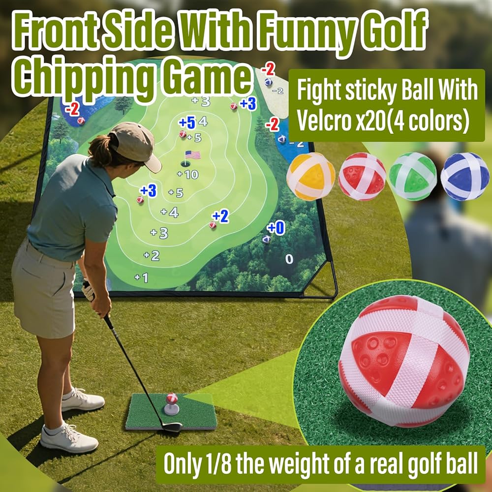 【Double-Side Golf Chipping Game Set】The chipping golf mat set is a great indoor and outdoor golf game and enjoy the classic game of darts for the whole family, is suitable for beginners and adults of all skill levels. This set includes a large double-sided golf game mat (70"x70"), 20 sticky golf balls, 2 golf clubs, 2 ball holder, 1 scoreboard with pen, 1 hitting mat, 2 toy axe, 4 star-shaped darts, 1 medals, 1 Storage Bag.