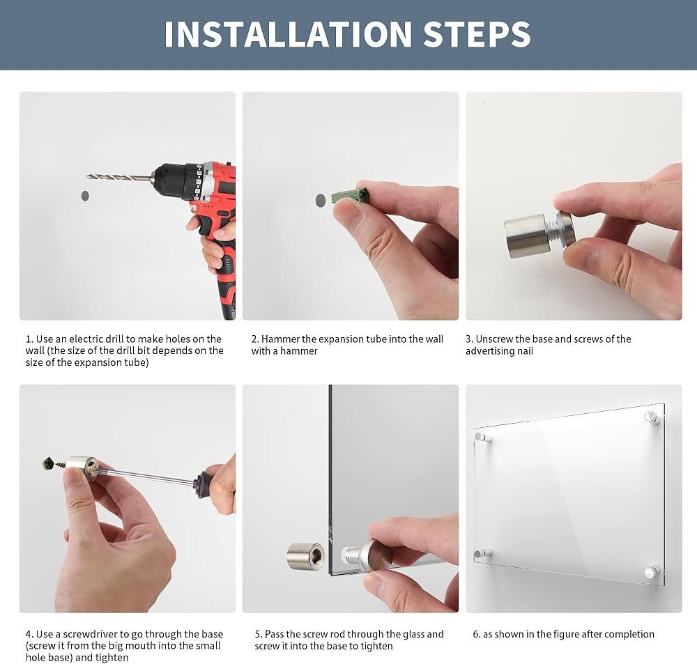 Matching Accessories: The wall sign standoff mounting is equipped with one white acrylic expansion plugs, one stainless steel screws, two non-slip transparent adhesive pads, a complete set of accessories, easy to install and give full play to the role of the glass nail fixing