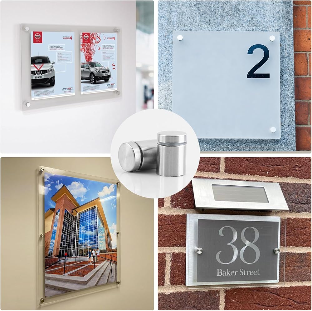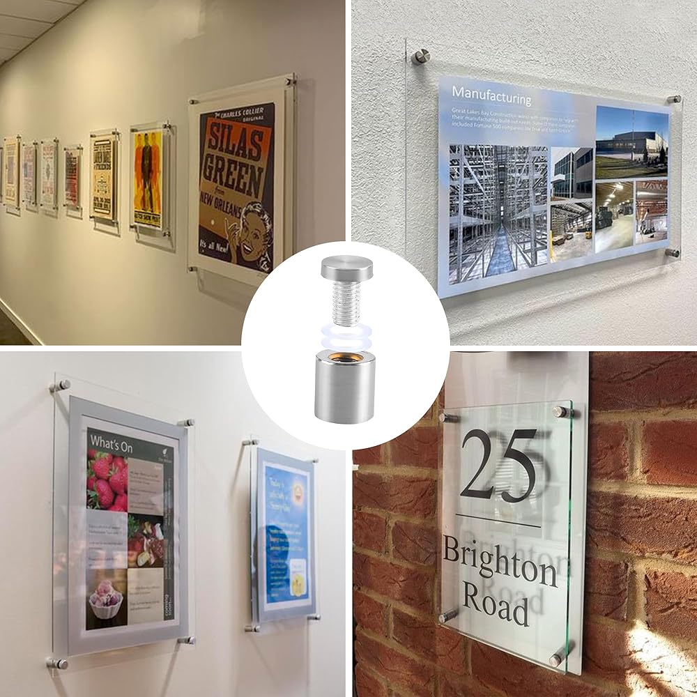 Product description: Axigundaone 70 Pcs Silver Stainless Steel Standoff Screws, Wall Sign Standoff Mounting for Hanging Acrylic Picture Frame, Hardware Advertising Glass Standoff Nail for Glass Artwork and Sign Displays