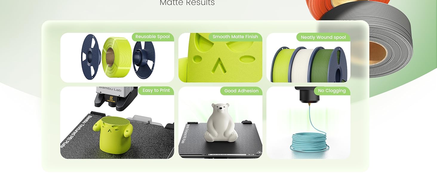Made for Smooth Printing: Each spool of matte PLA filament is machine-wound for clean, organized layering to prevent tangles during printing. With a strict dimensional tolerance of ±0.02mm, supporting stable, high-quality prints from start to finish.